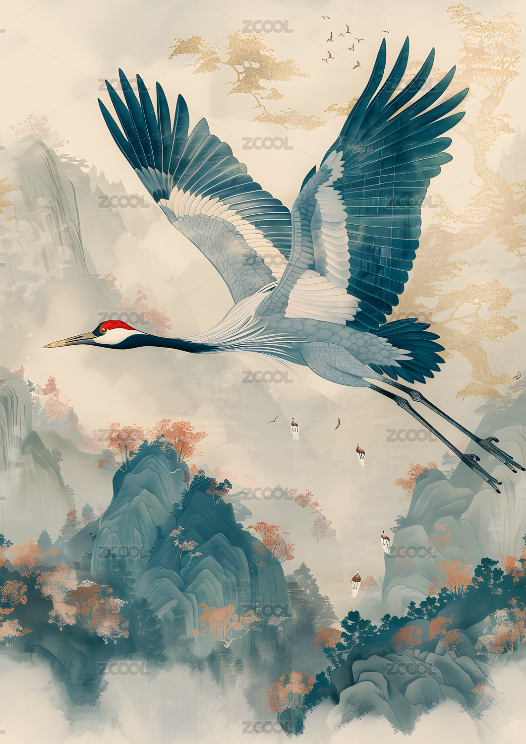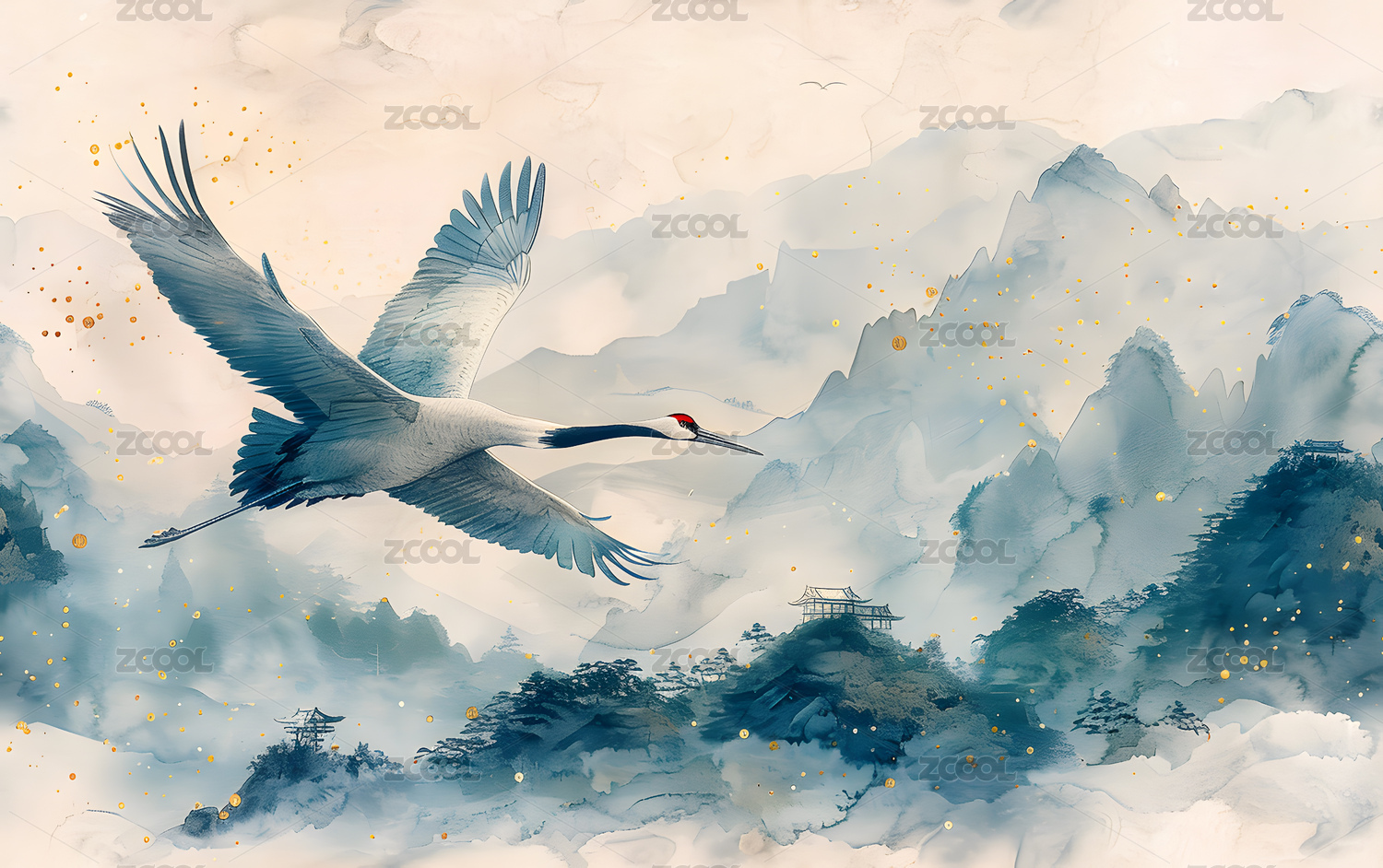 水墨风云雾中的仙鹤插画