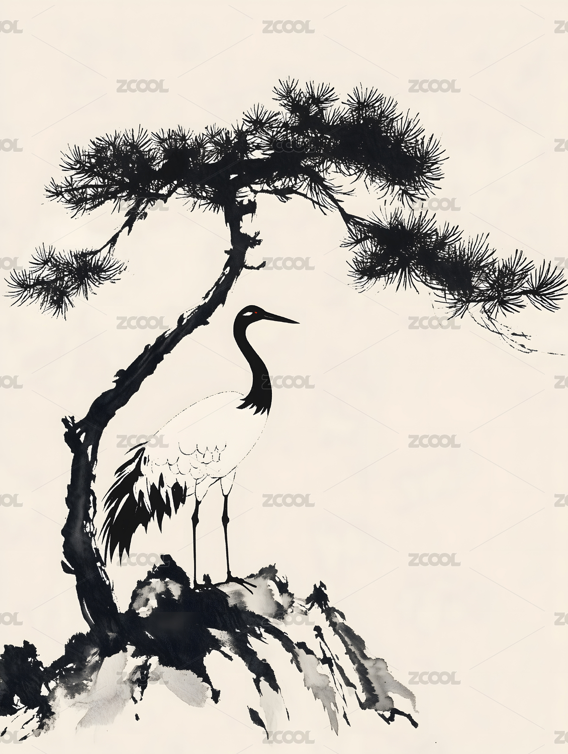 水墨丹顶鹤独立寒岩