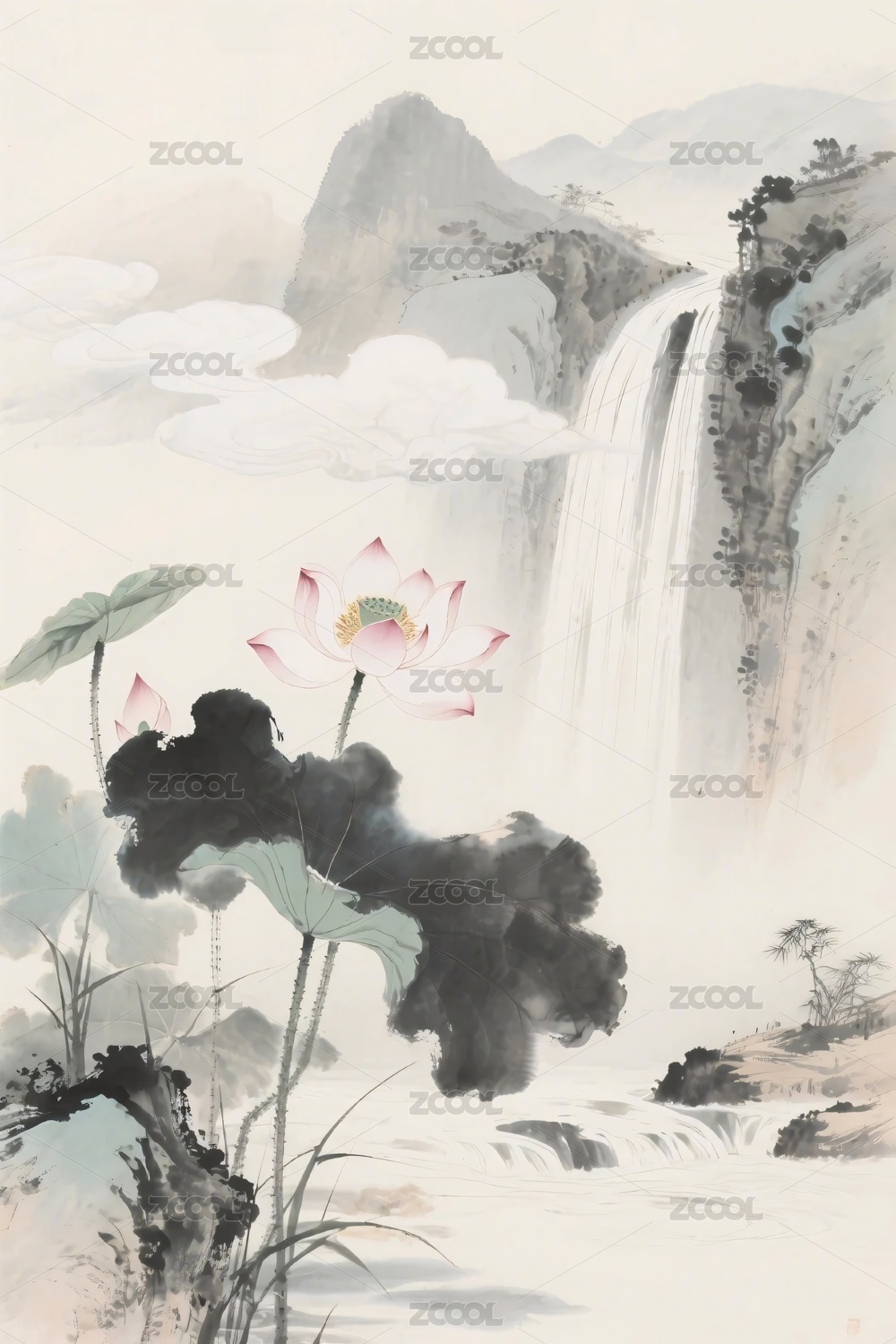 国画山水荷花水墨图