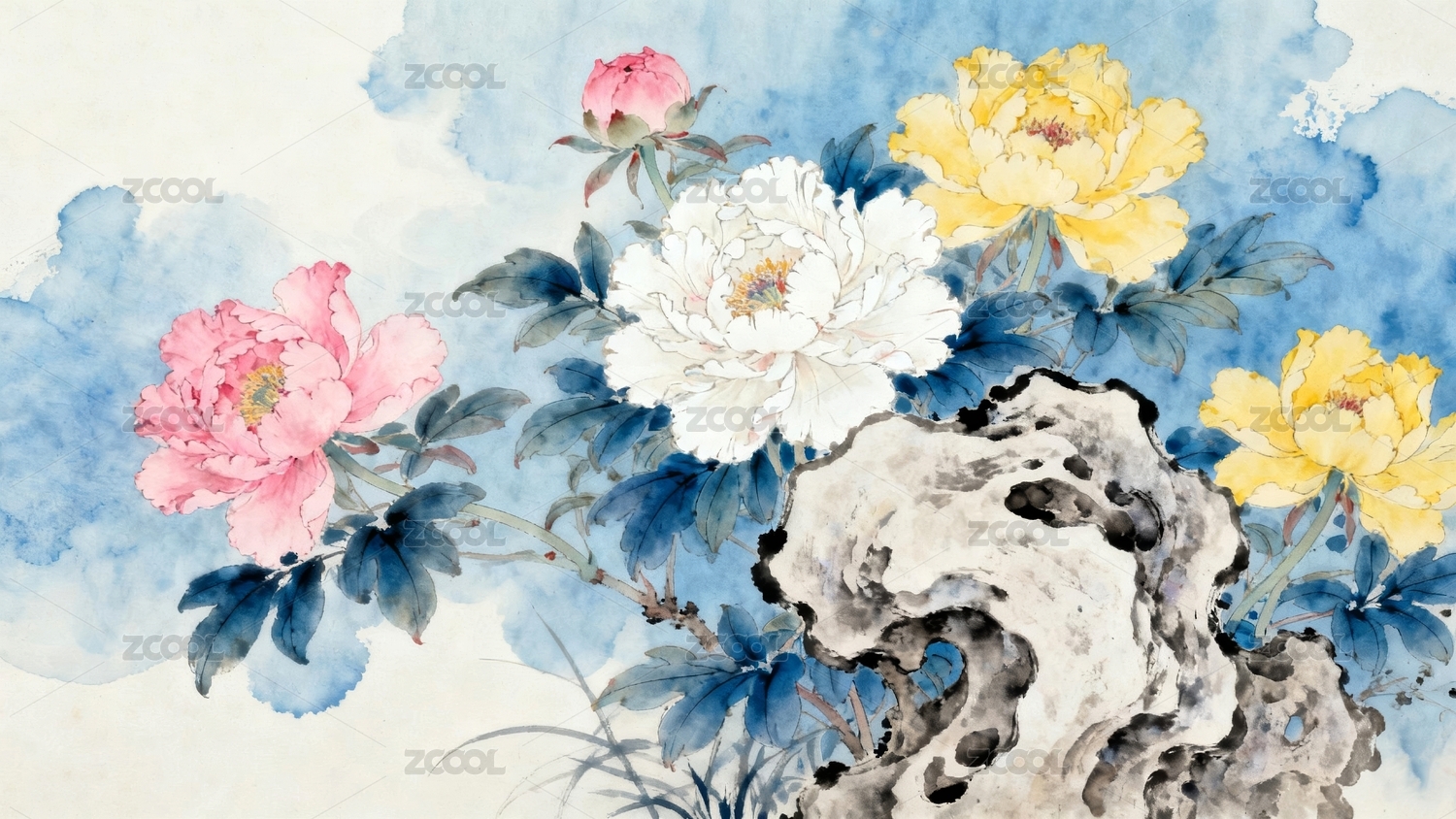 牡丹山石国潮风绘画场景