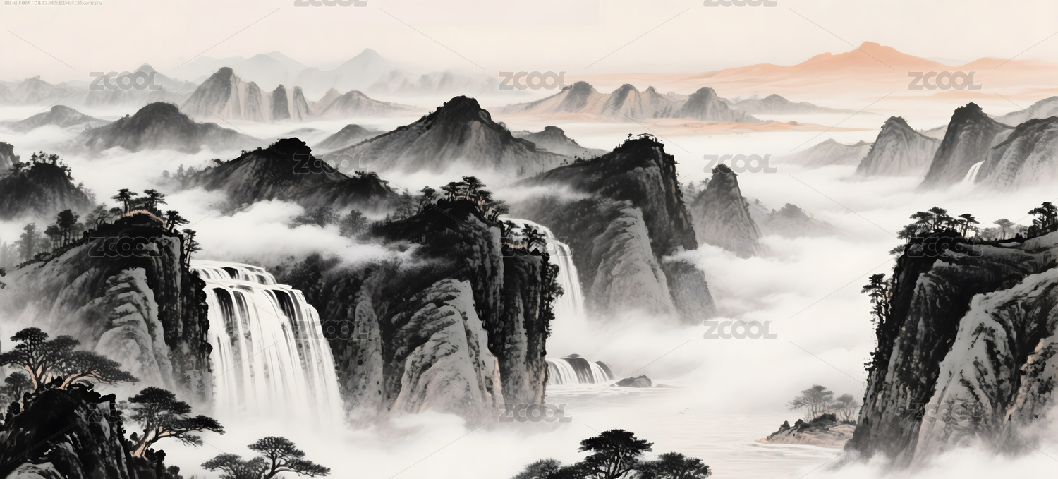 艺术,云雾,古风,宁静,山峰,瀑布,水流,国画,中国风,水墨画