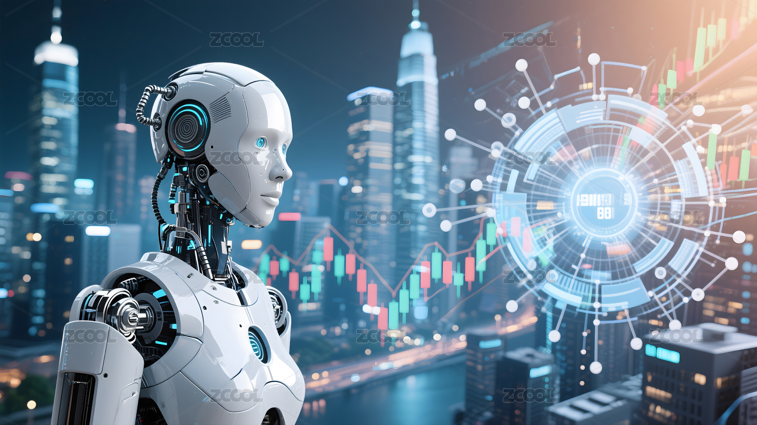 白色机械臂映夜城景