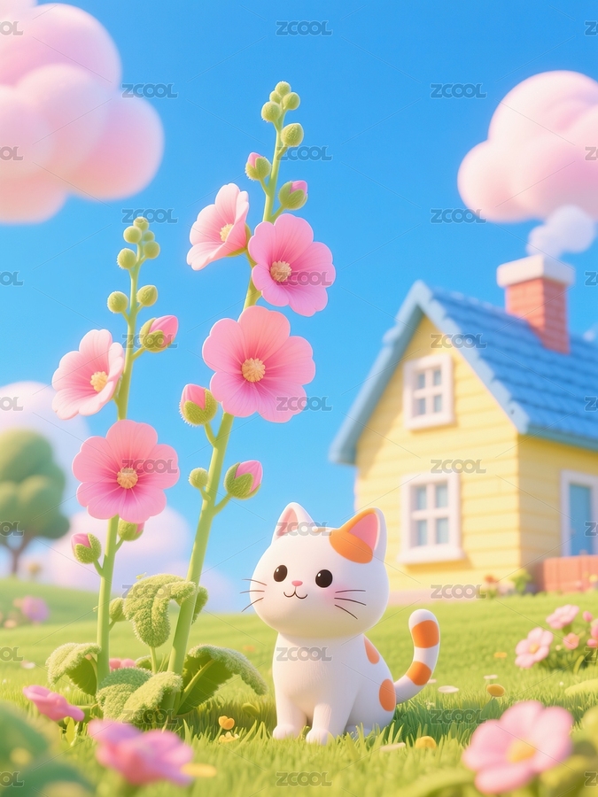 3D,卡通,可爱,猫,蜀葵,花朵,春天,房子