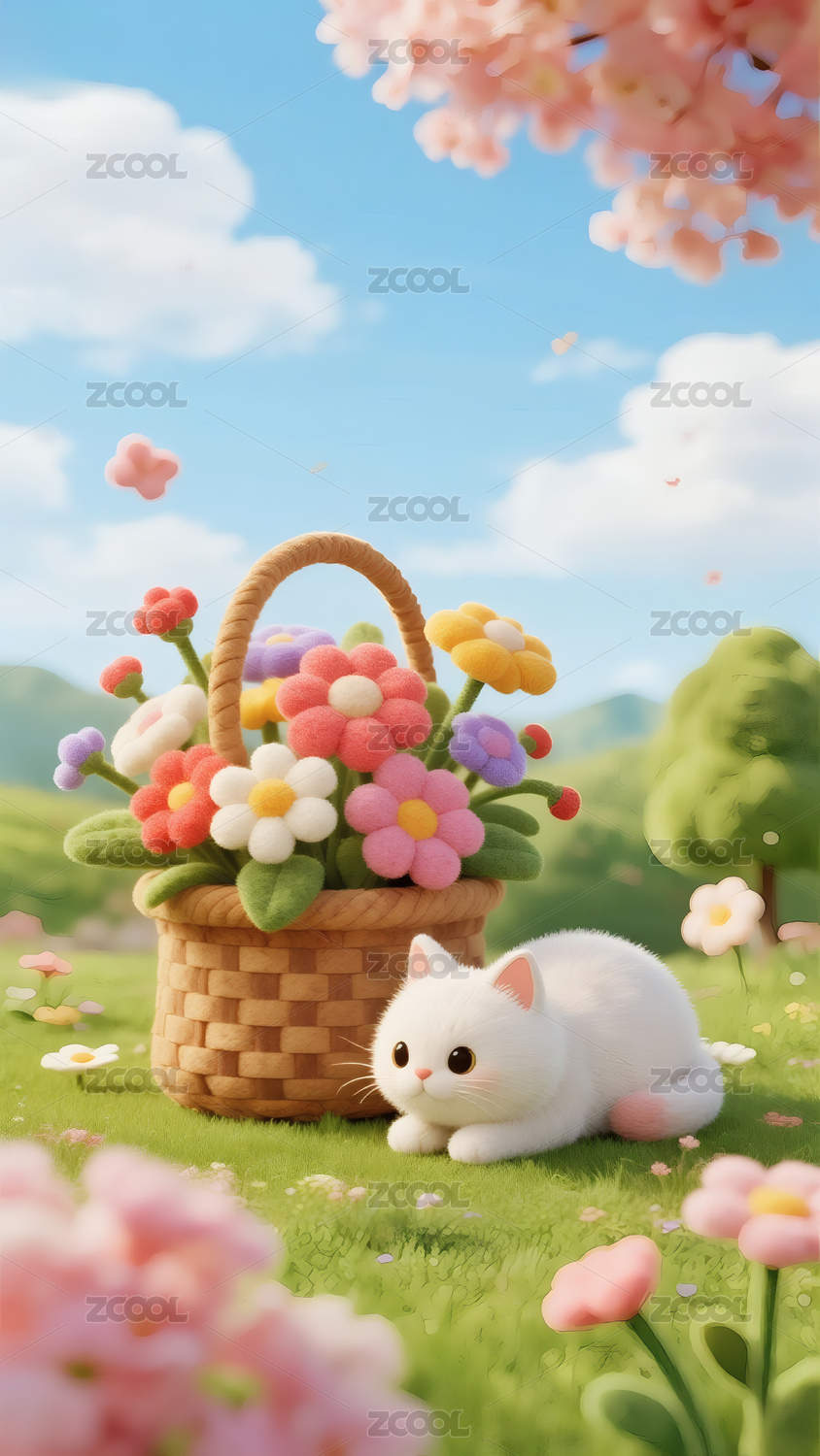 春天的花篮与白猫