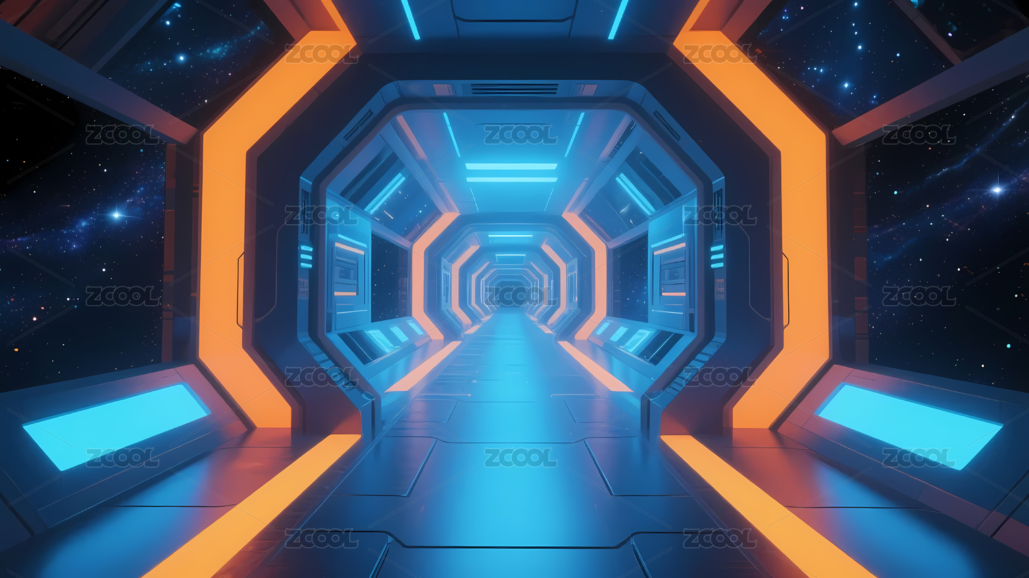 蓝色,科幻,灯光,橙色,星空,未来,科技,走廊,通道,银河