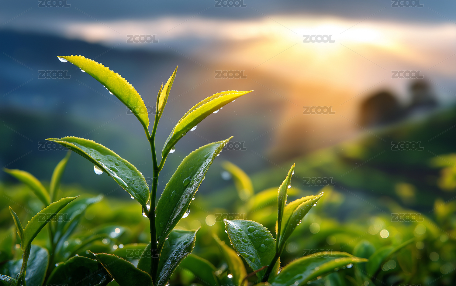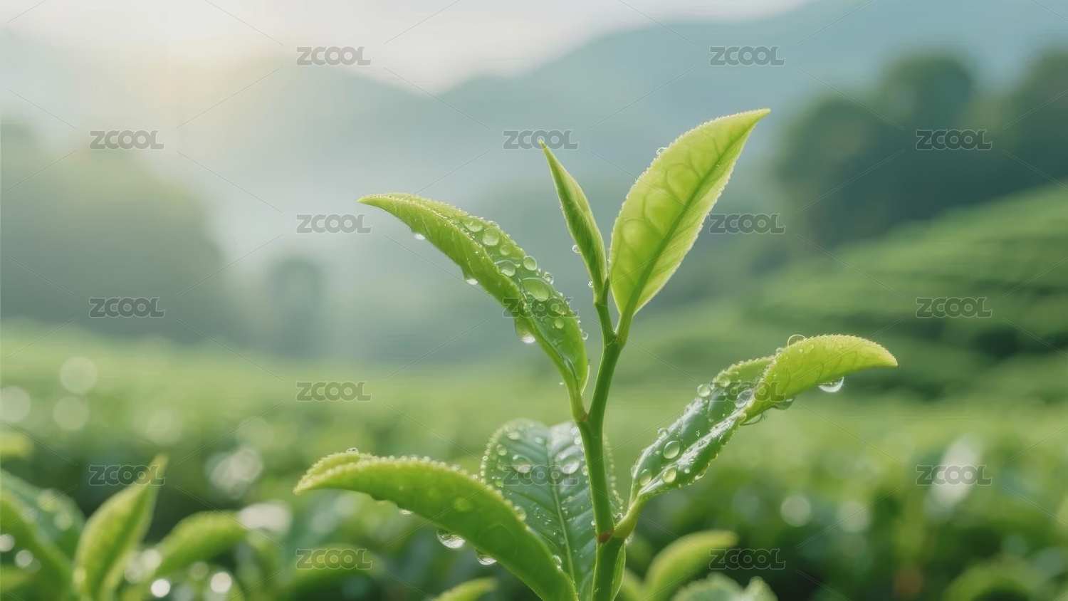 清晨茶园嫩芽上的露珠晶莹剔透