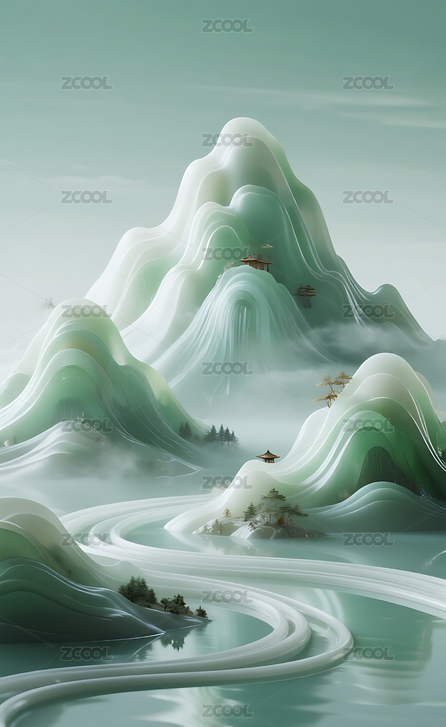 有亭台楼阁小桥流水的仙境绿色山水3D卡通
