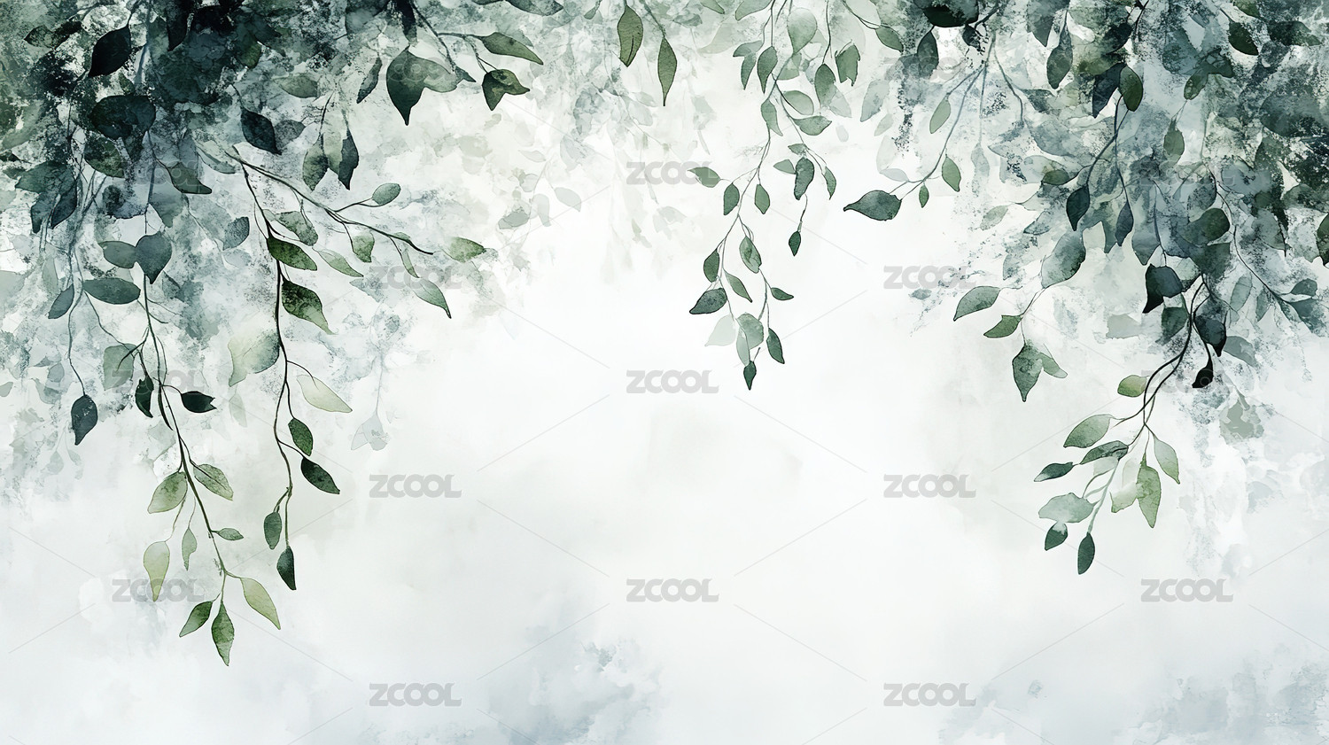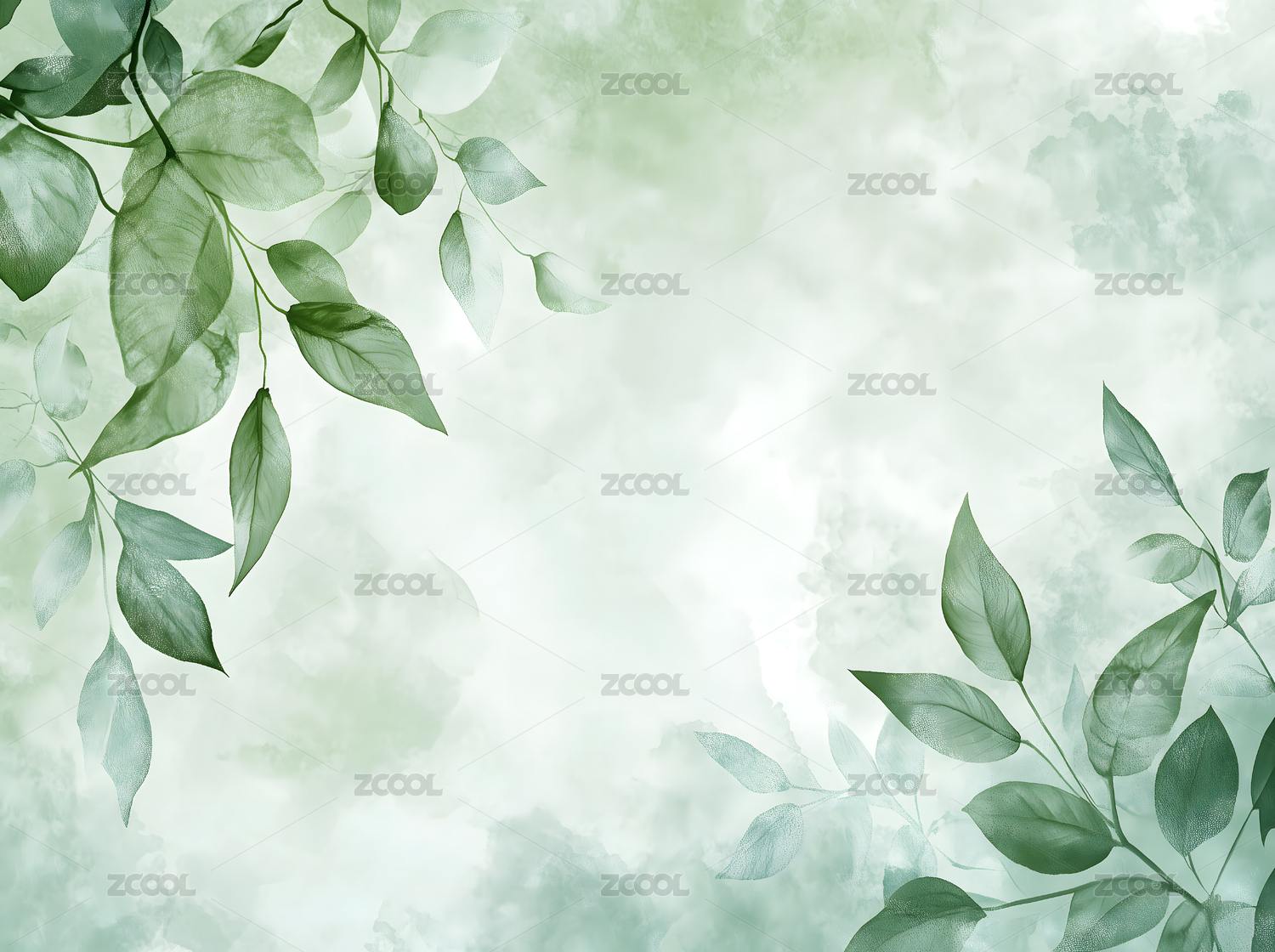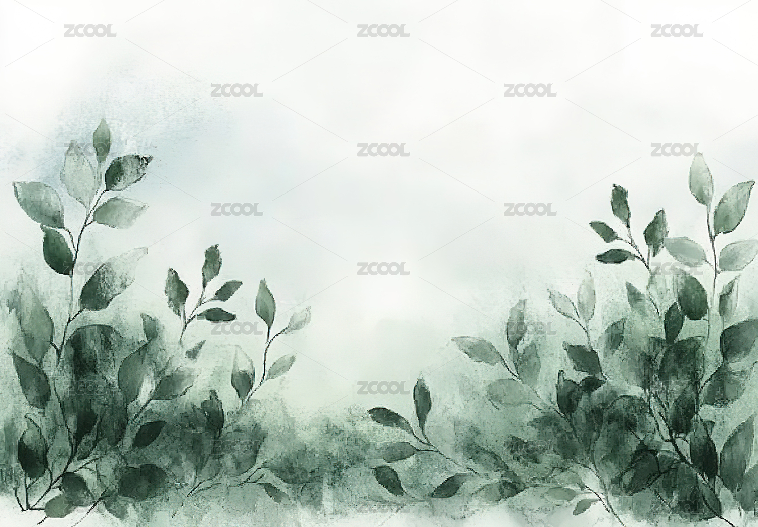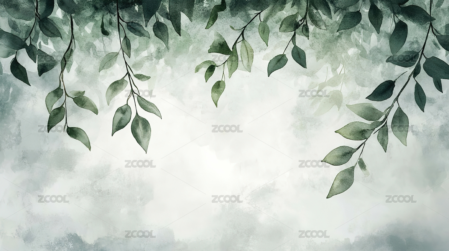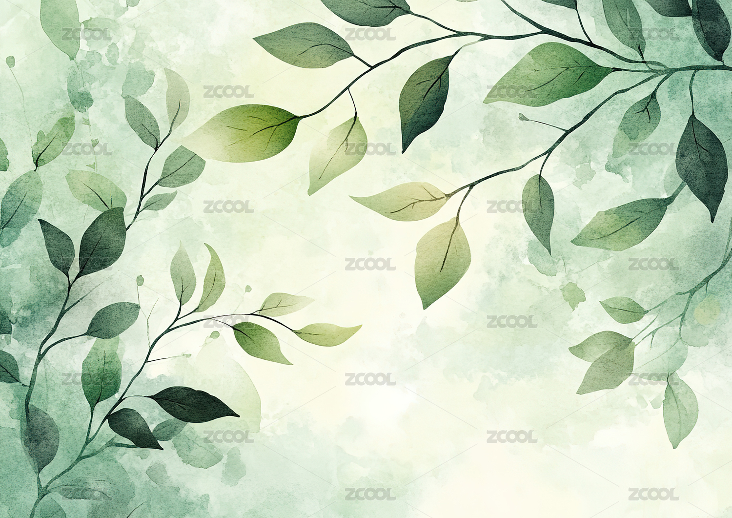 柔和的绿叶与平静的水彩背景