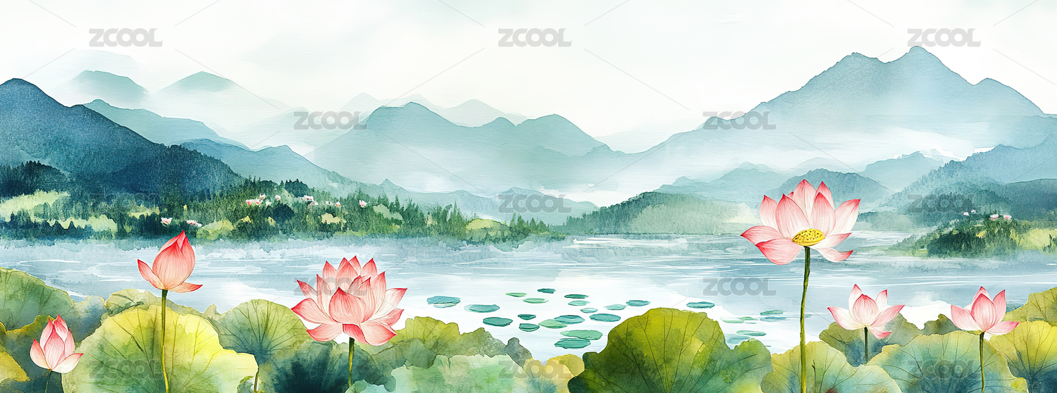 群山间的荷花水池插画