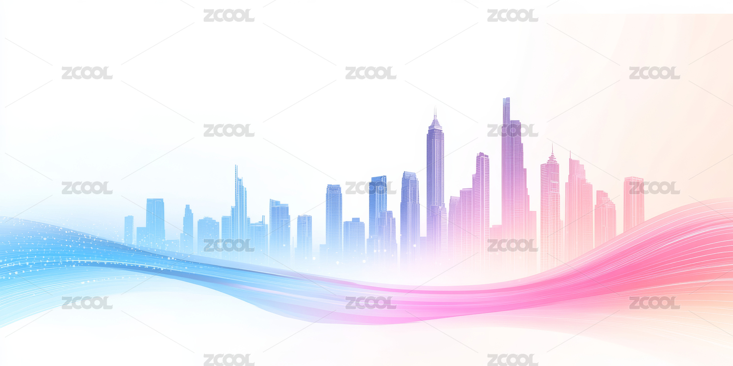粉色城市剪影与红色波浪线条