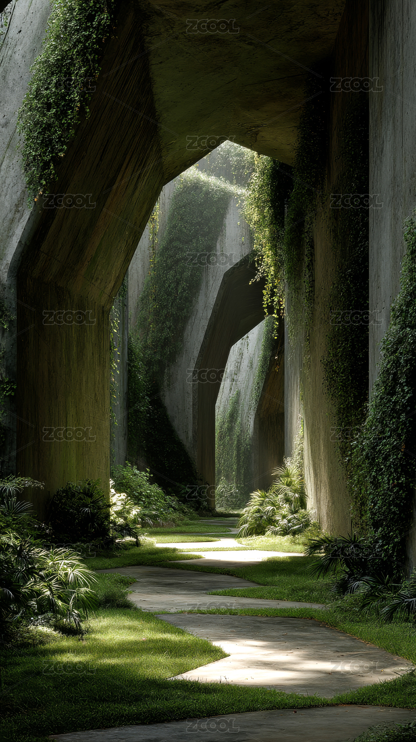 布满藤蔓绿植的混凝土走廊未来科幻生态