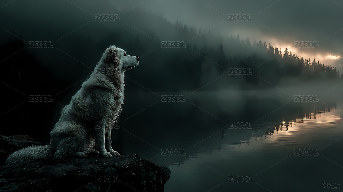 自然,环境,光线,倒影,白犬,湖畔,守望,岩石,晨雾,森林