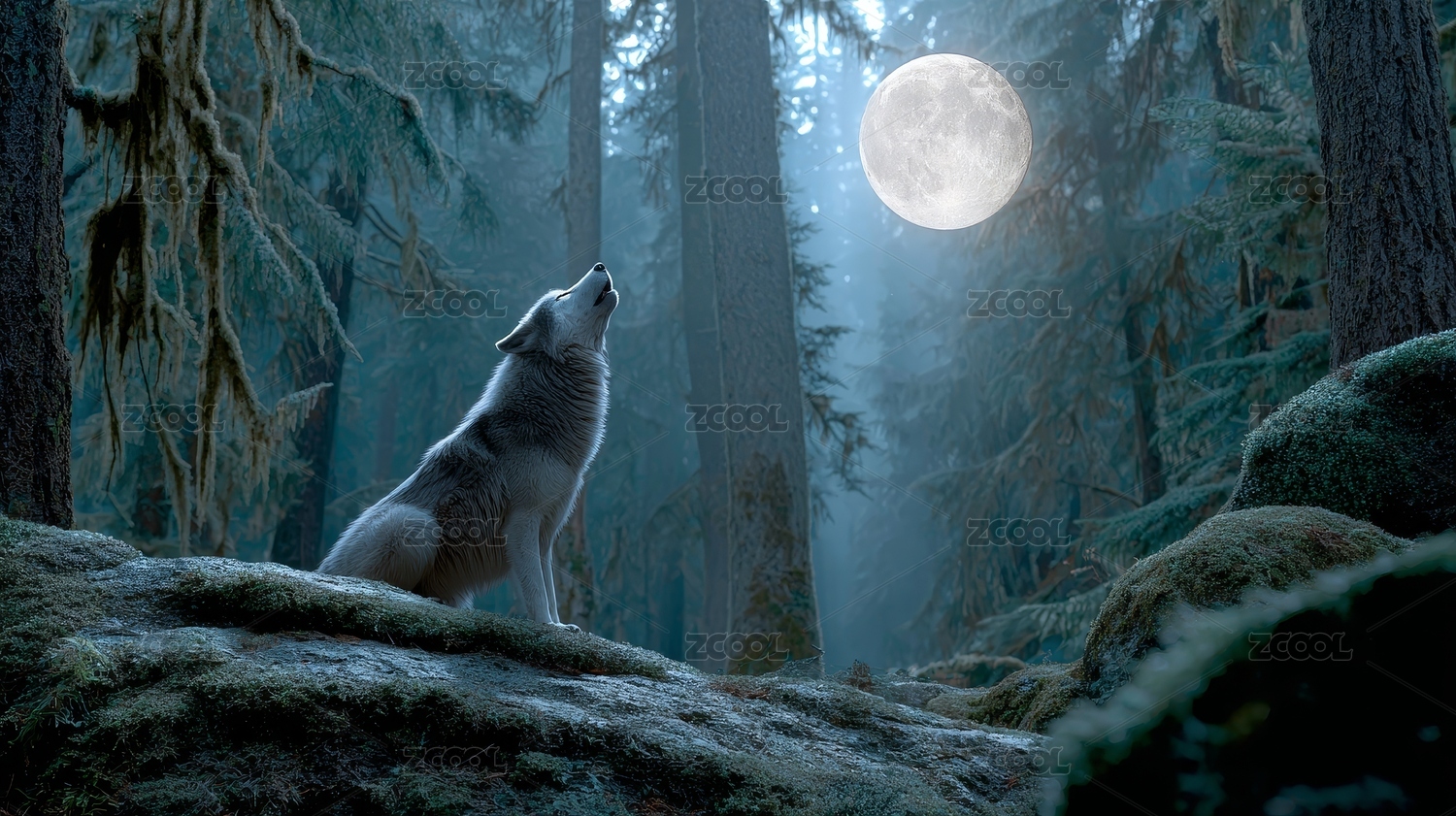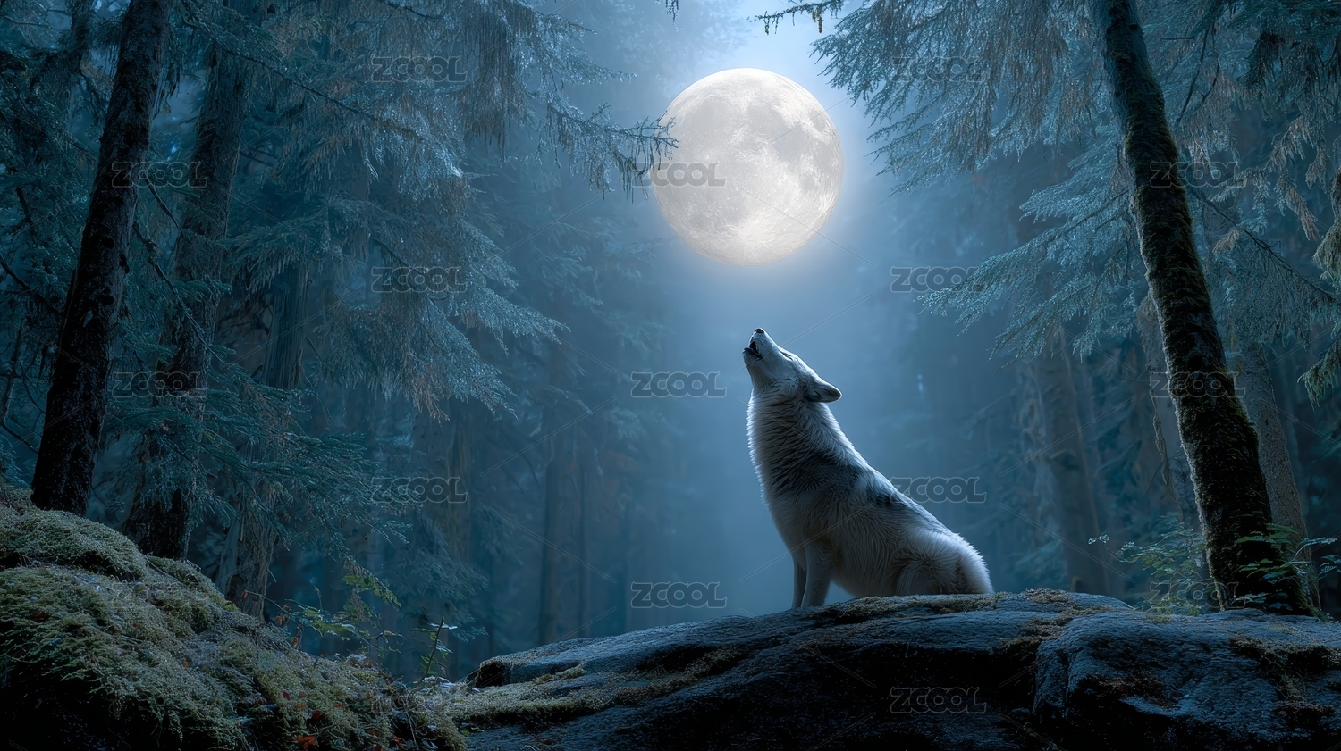 满月下森林中嚎叫的白狼