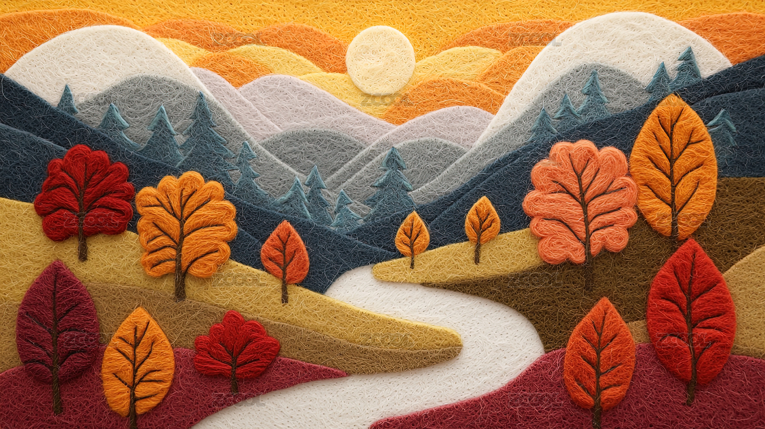 毛毡质地秋季金色的森林风景插画