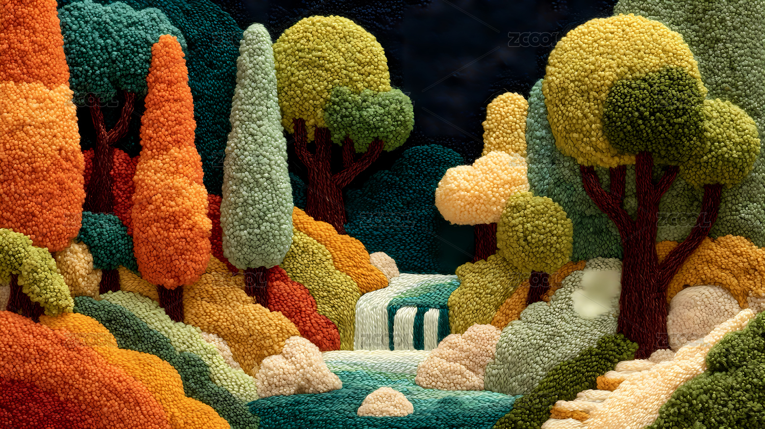 针织森林与瀑布的夜景