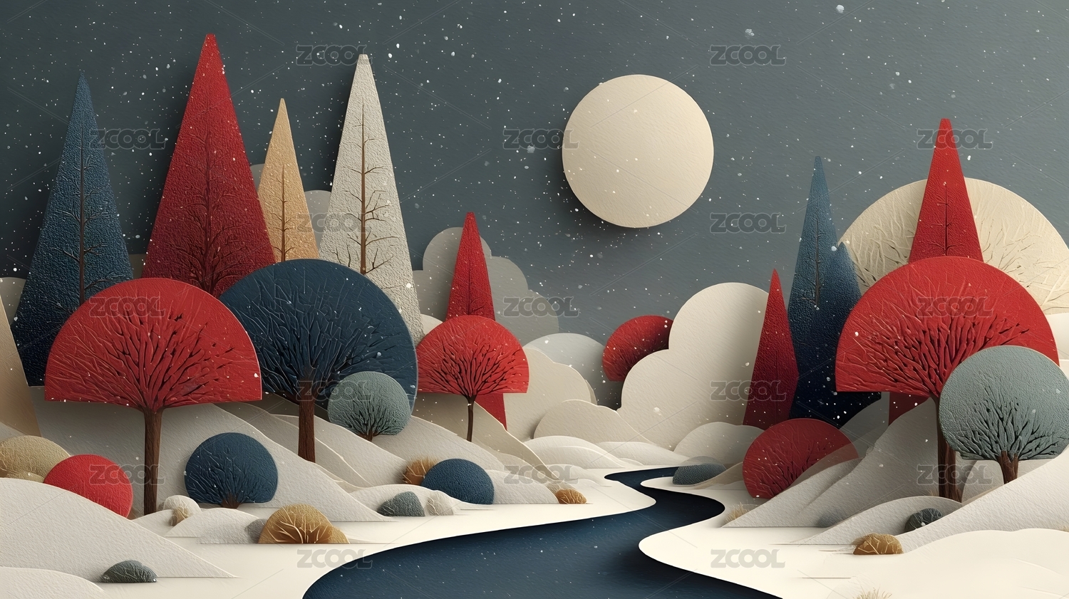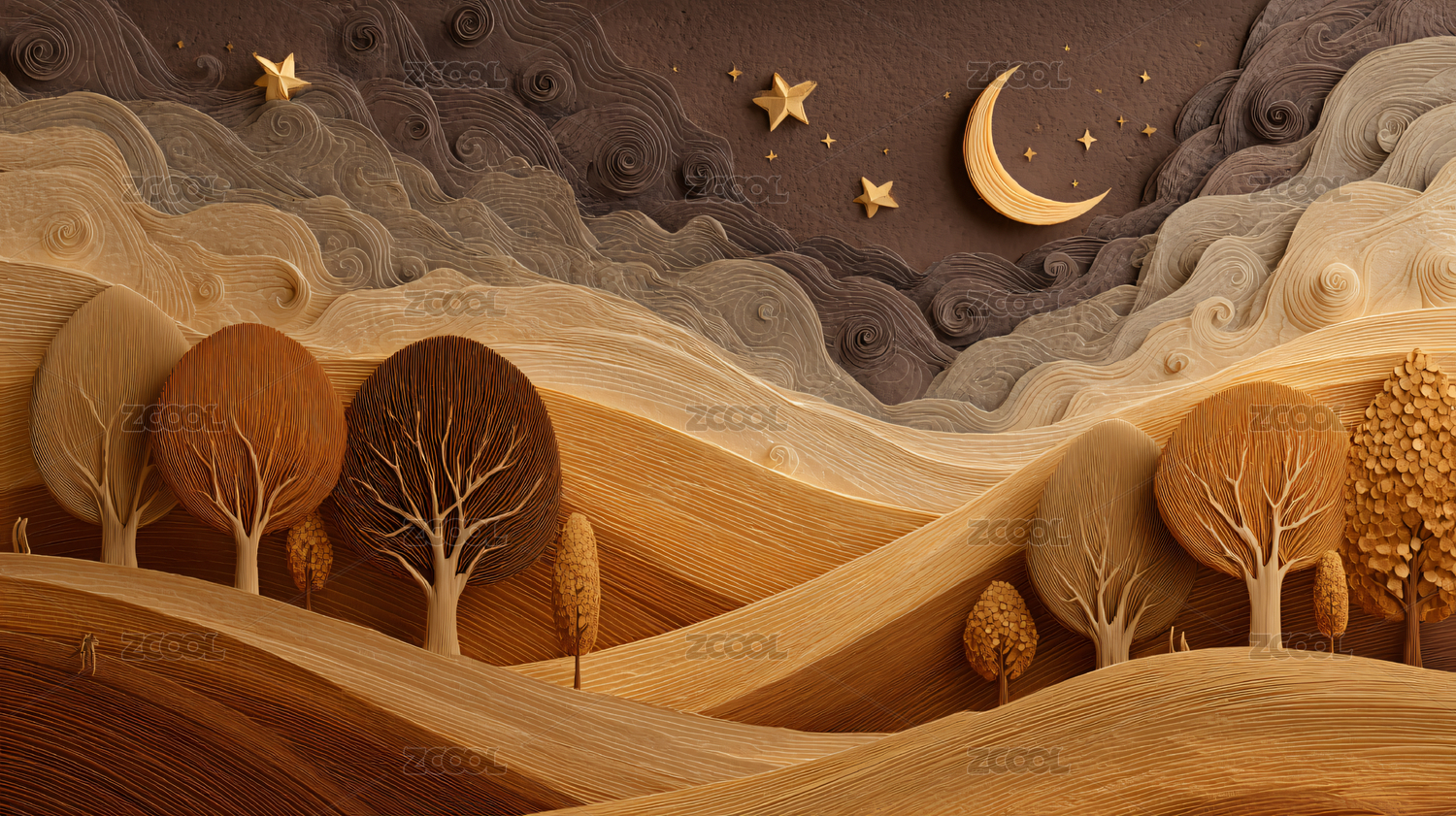 暖棕纸艺夜景山丘树木星月艺术图