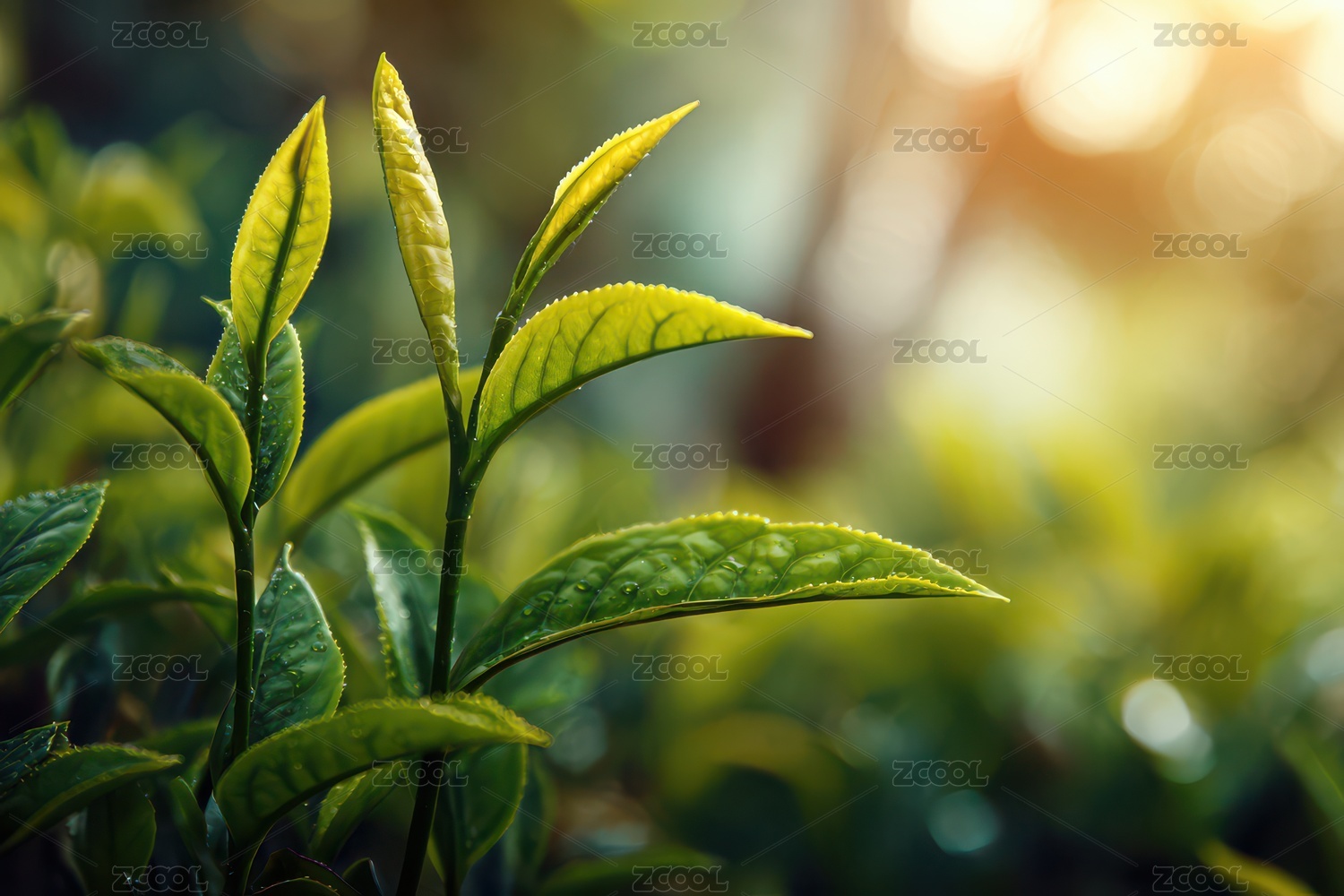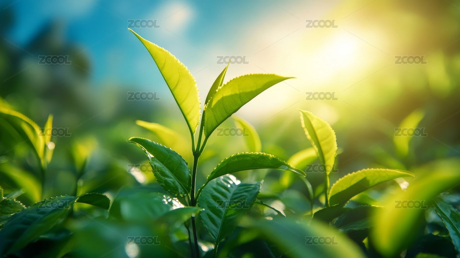 茶叶嫩芽沐浴阳光的自然景象