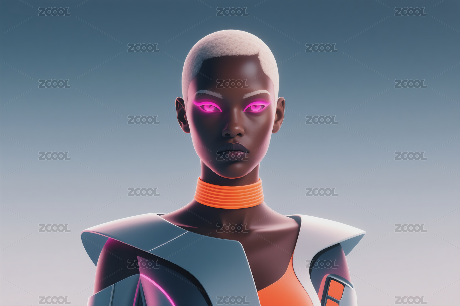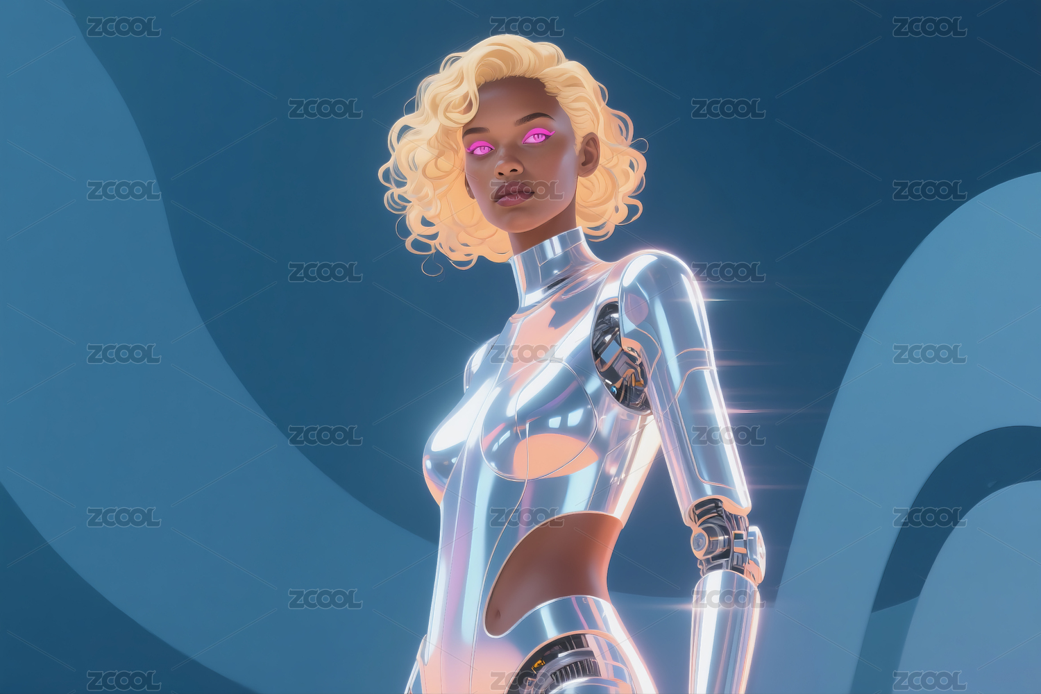 蓝底女青年穿着发光金属铠甲3D立体插画
