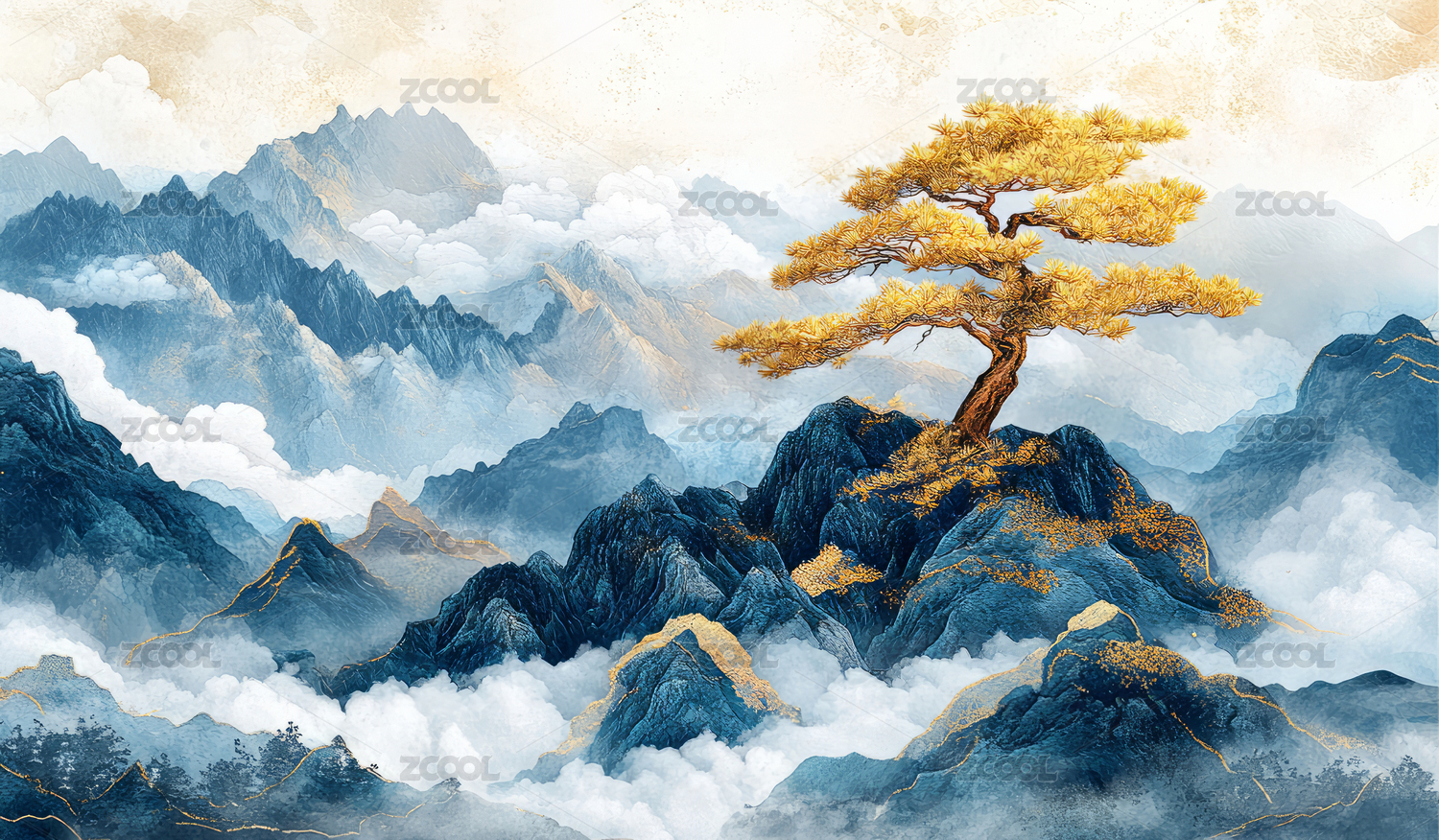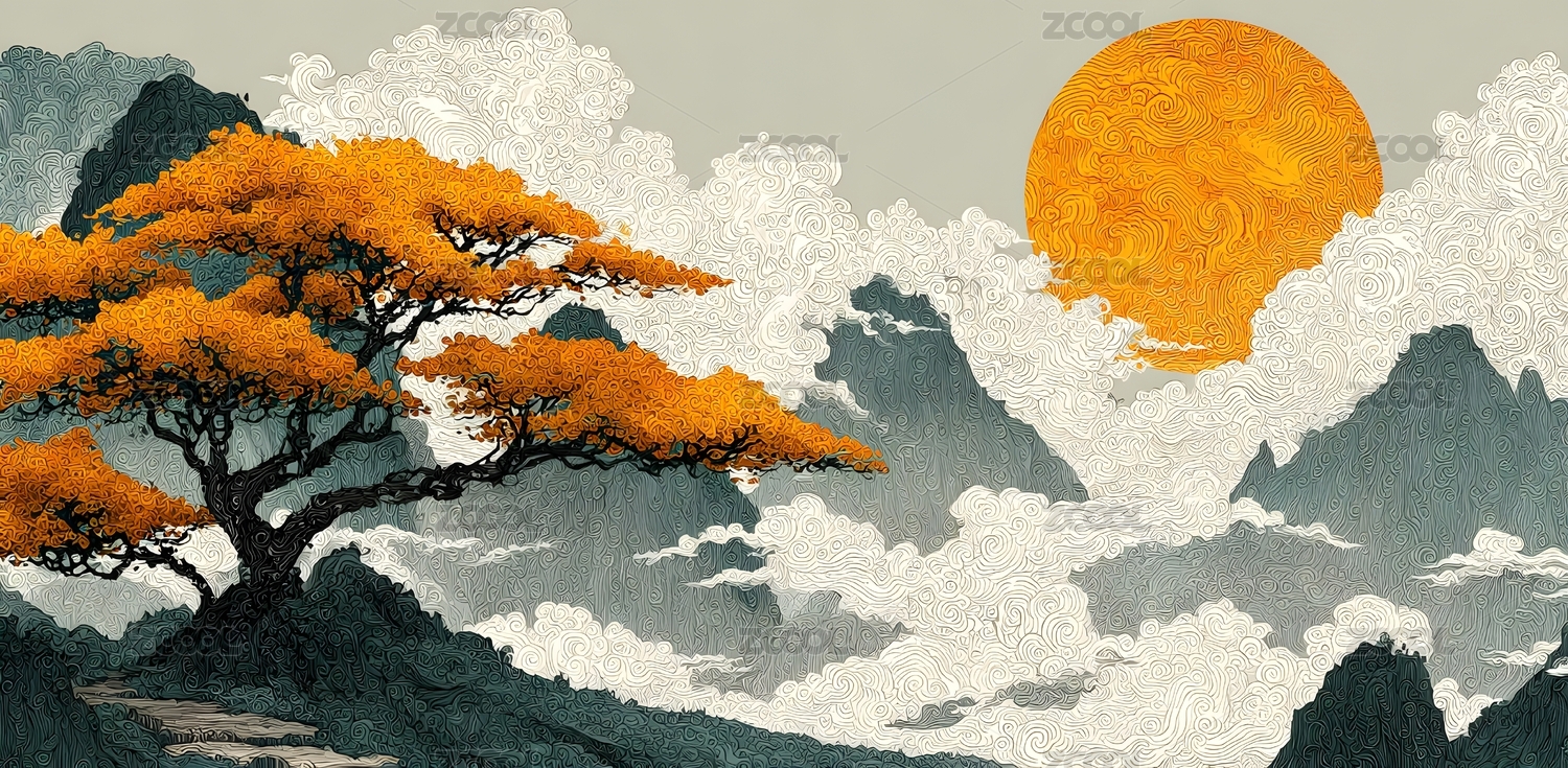 唯美,艺术,绘画,自然,格式,水墨,山林,秋色,金黄,静谧