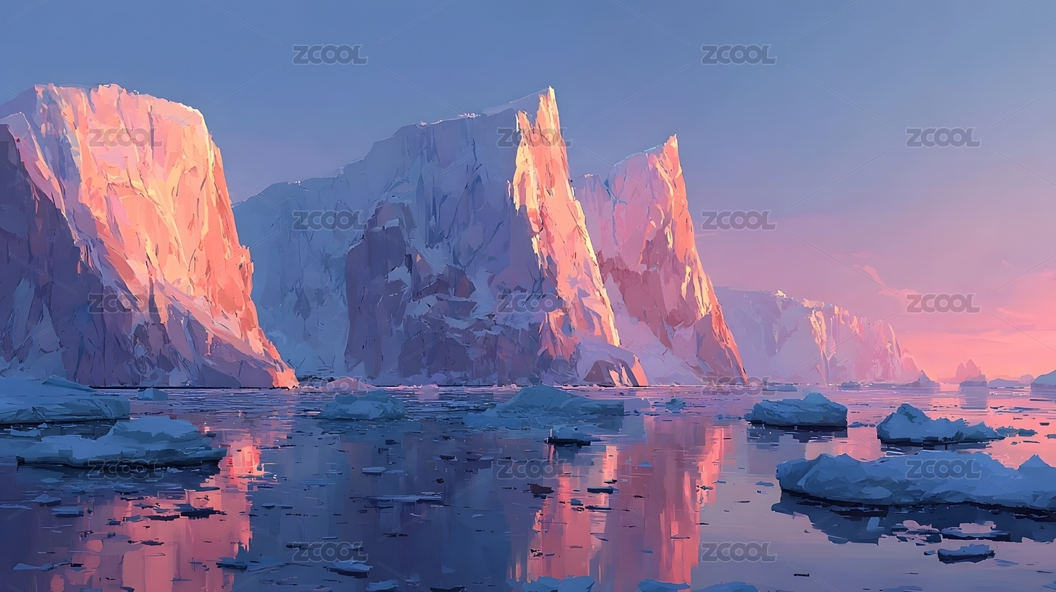 冰山夕阳映照下的粉色海面