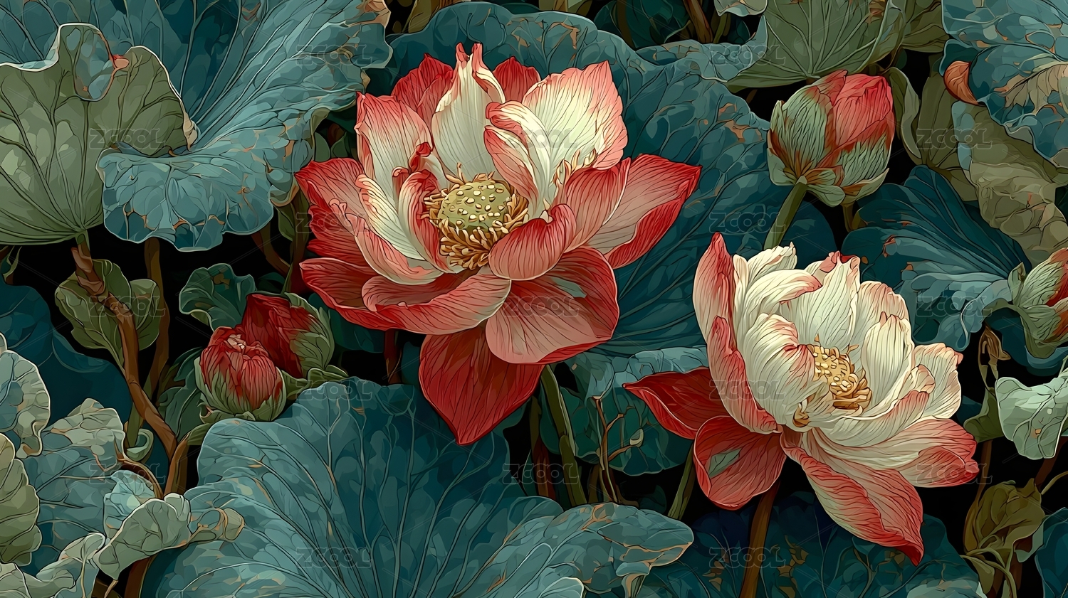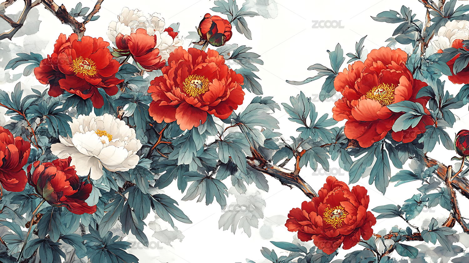 红牡丹簇拥在翠蓝底纹上绽放,优雅静谧