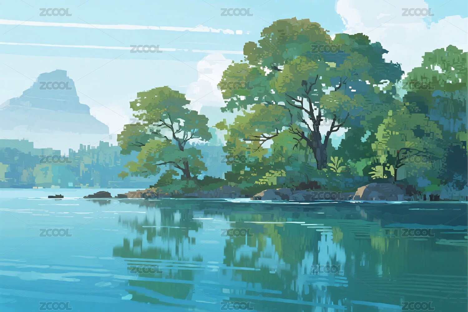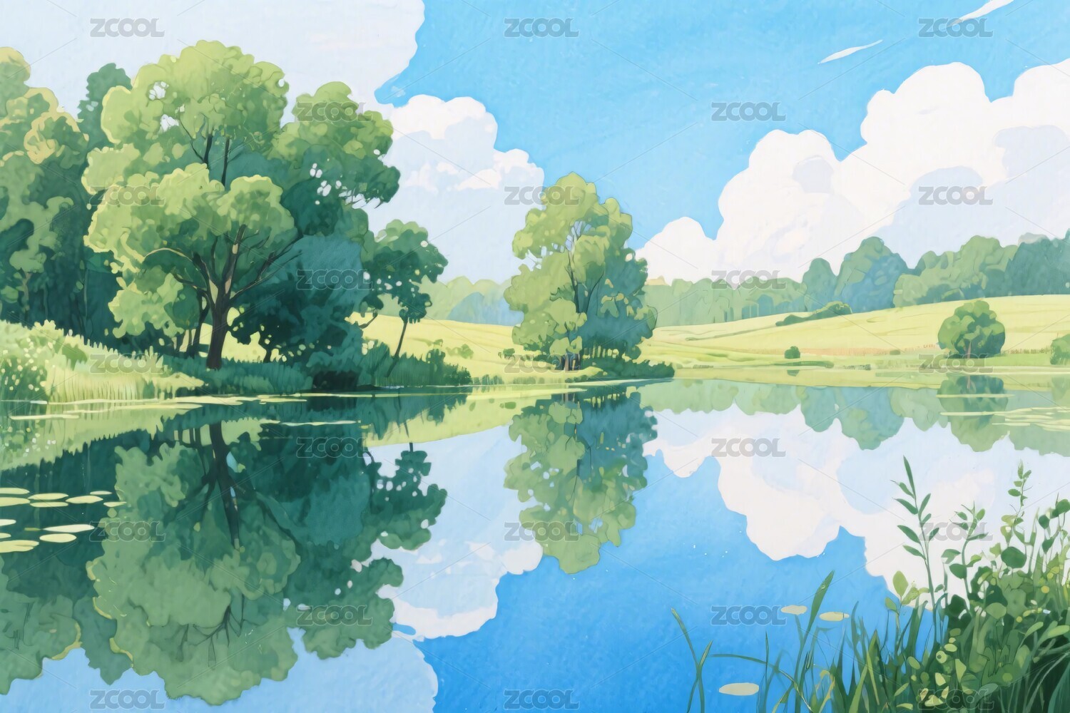 湖泊,垂柳,风景,自然,插画,风景画,草地,树木,蓝天,水面