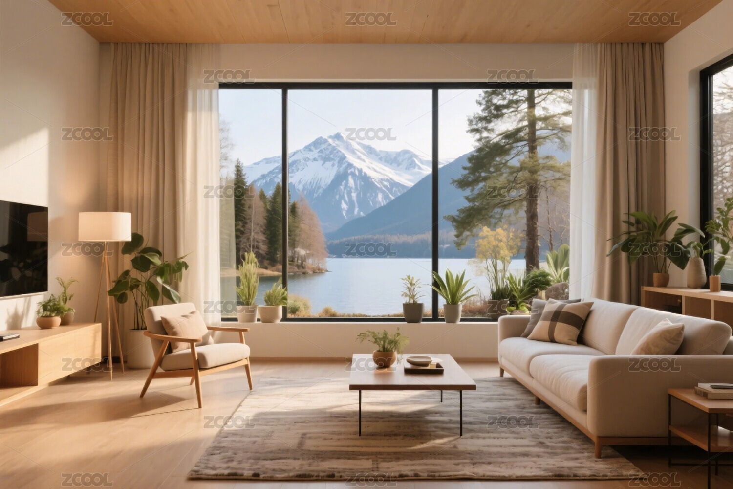 客厅,沙发,圆形窗,山景,自然景观,现代简约,家具,木质天花板,落地窗,木地板