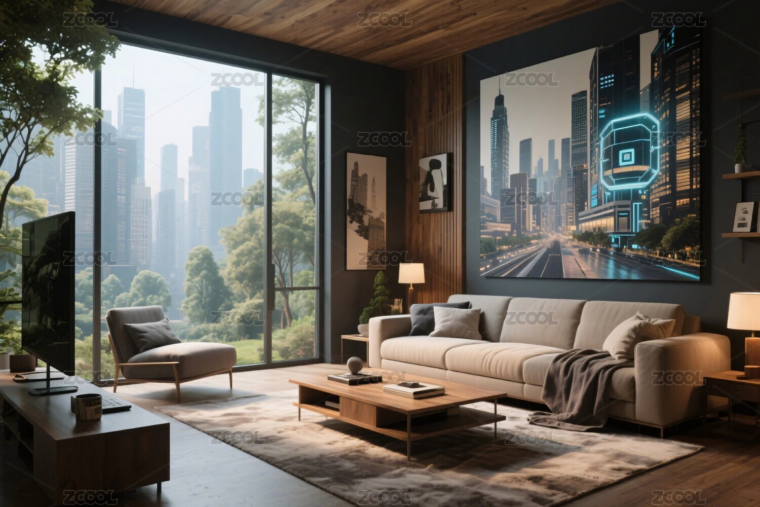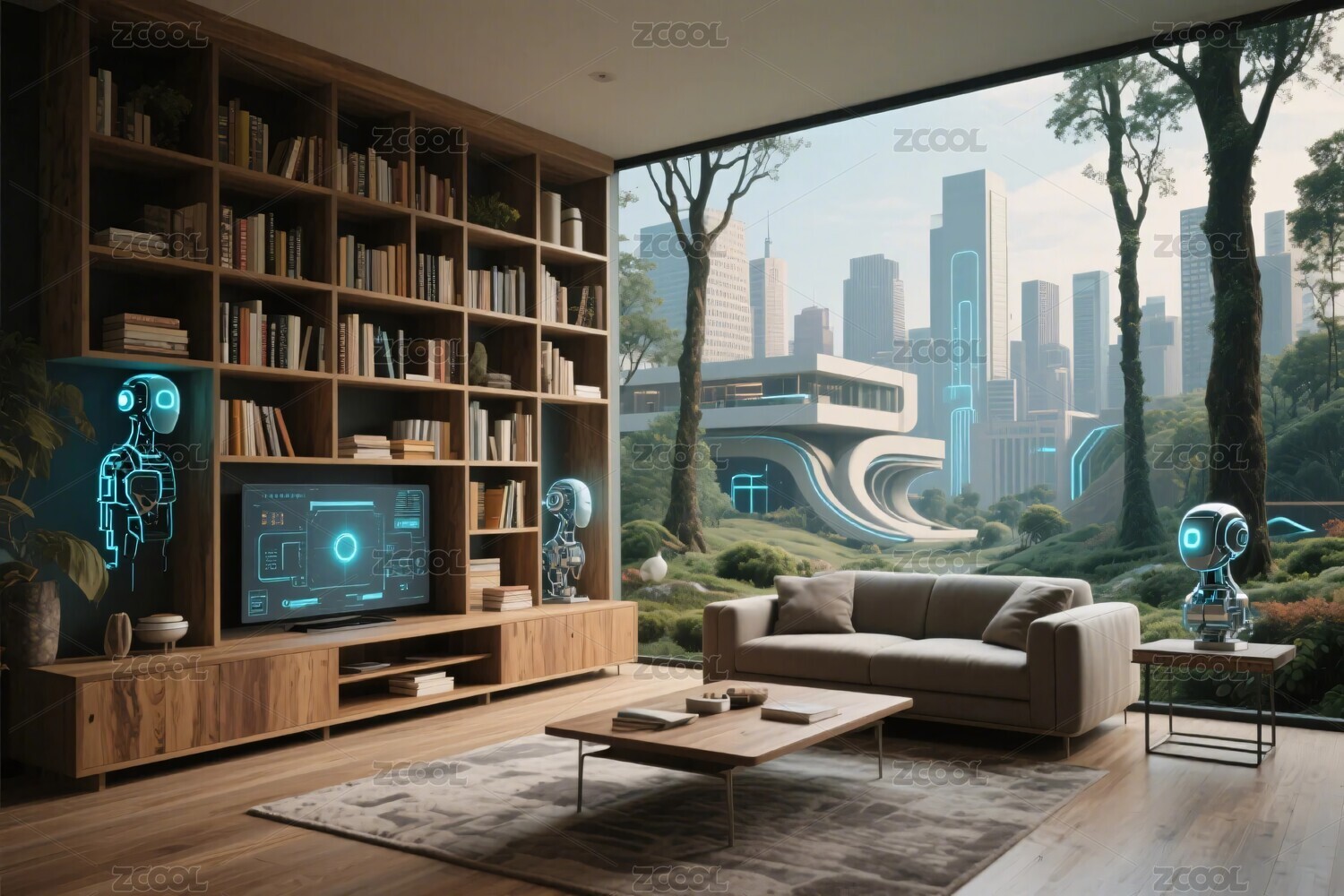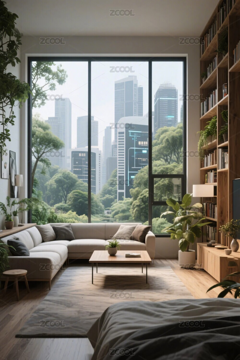 客厅,沙发,书架,落地窗,城市景观,树木,智能家居,现代设计,空间,自然元素