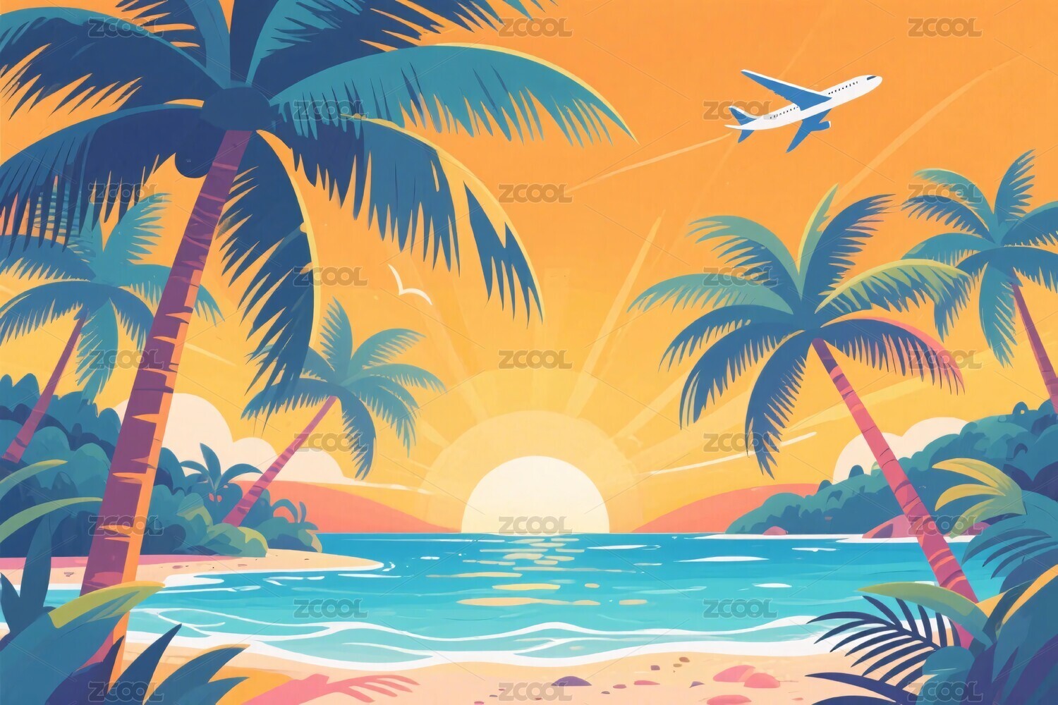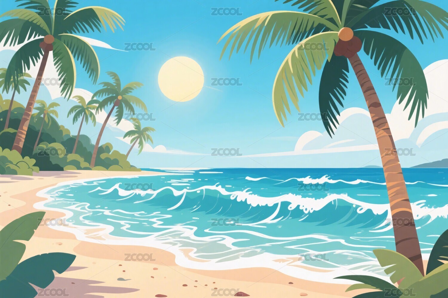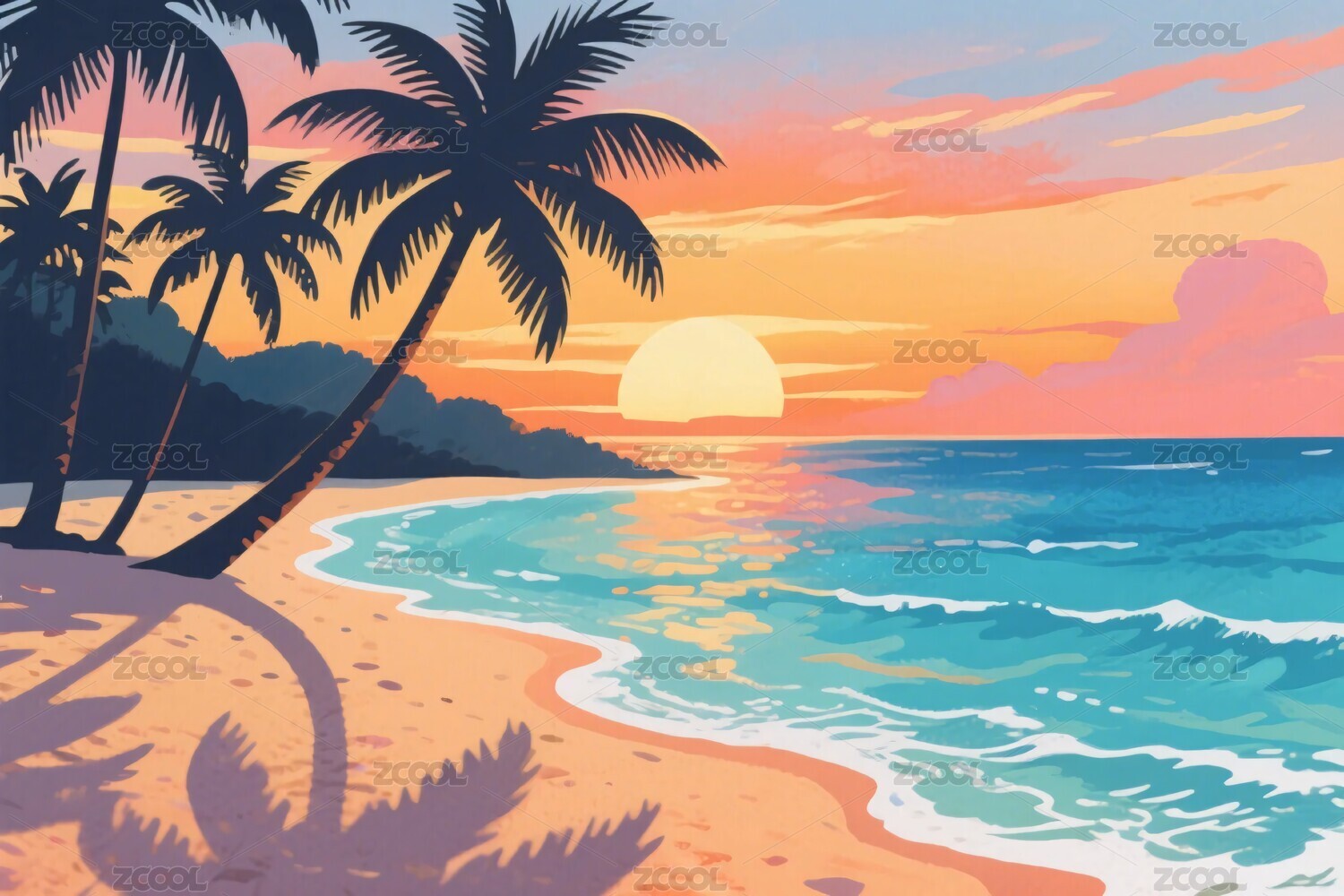 海滩,太阳,椰子树,彩衣,躺椅,沙滩,海景,插画,明亮,度假