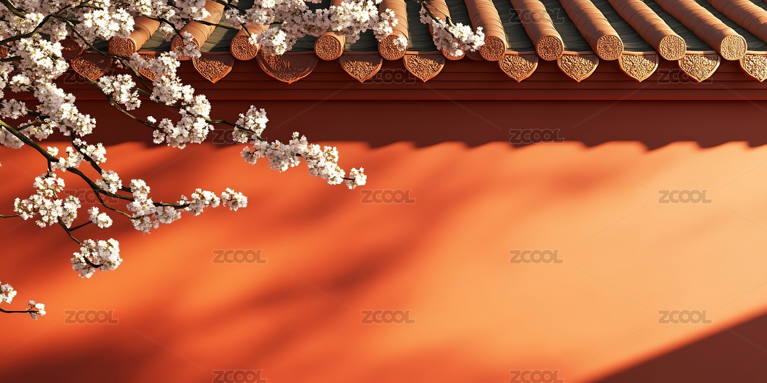 粉色樱花盆栽映衬朱红色墙面