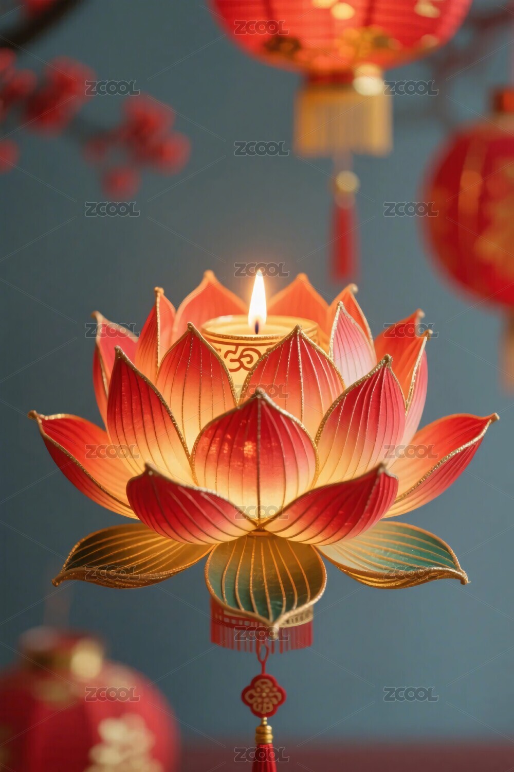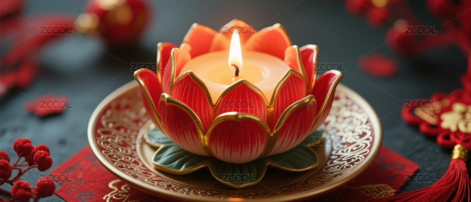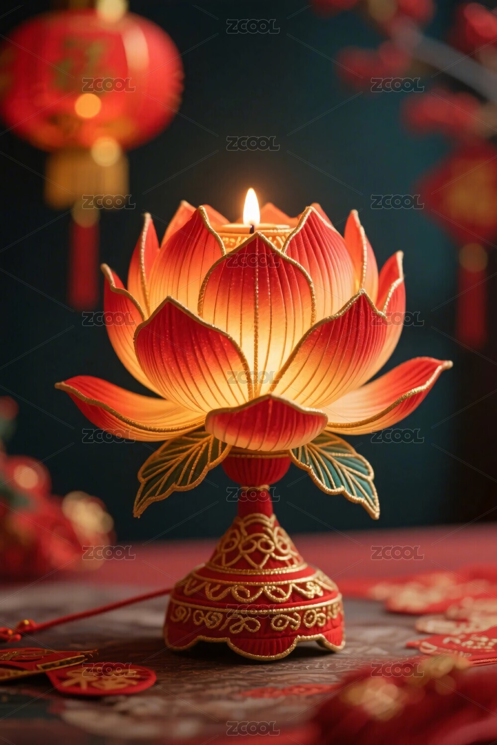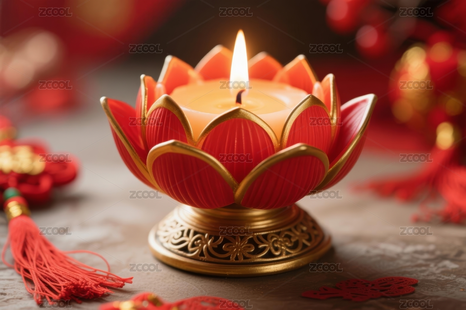 莲花,烛台,蜡烛,装饰,红灯笼,传统元素,暖光,红色,金色,节庆