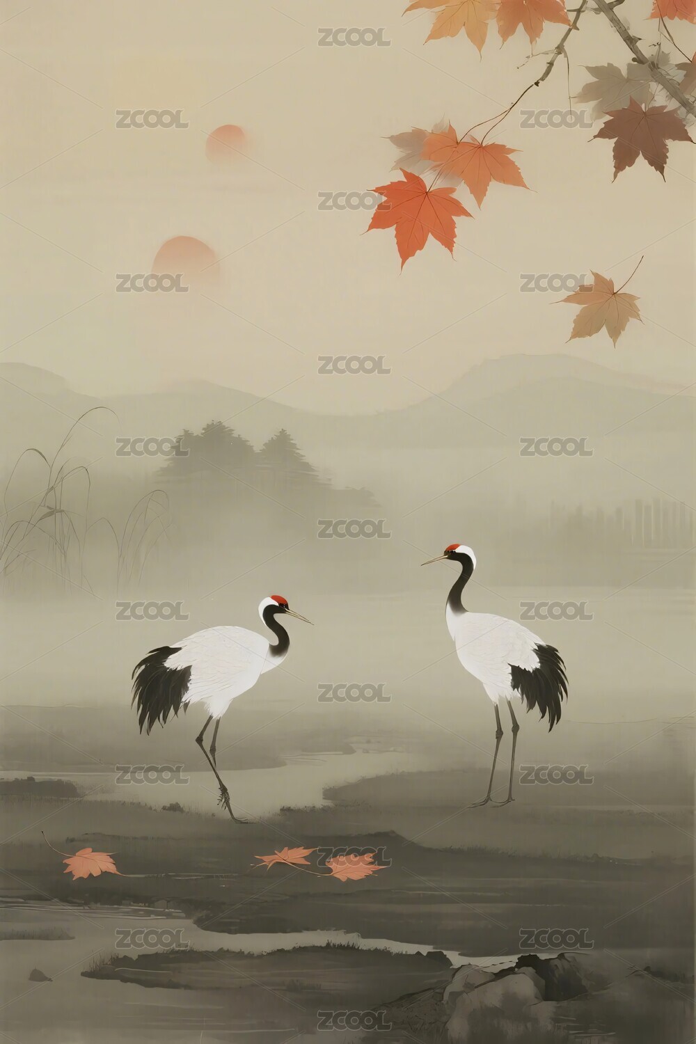 丹顶鹤与红叶水墨画