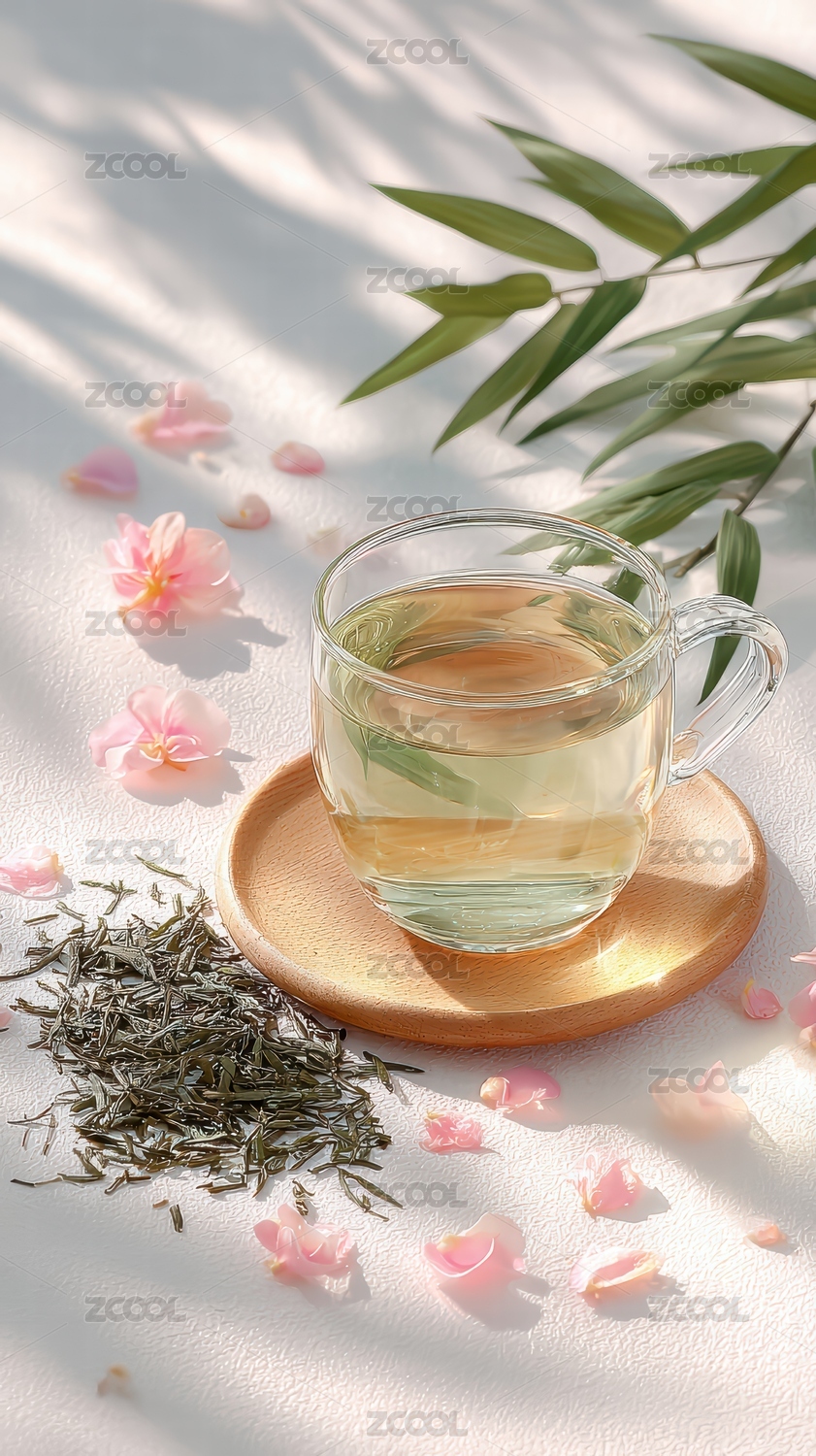 夏日,茶饮,白花,清透,玻璃杯,浅黄,薄荷,绿叶,阳光,木桌