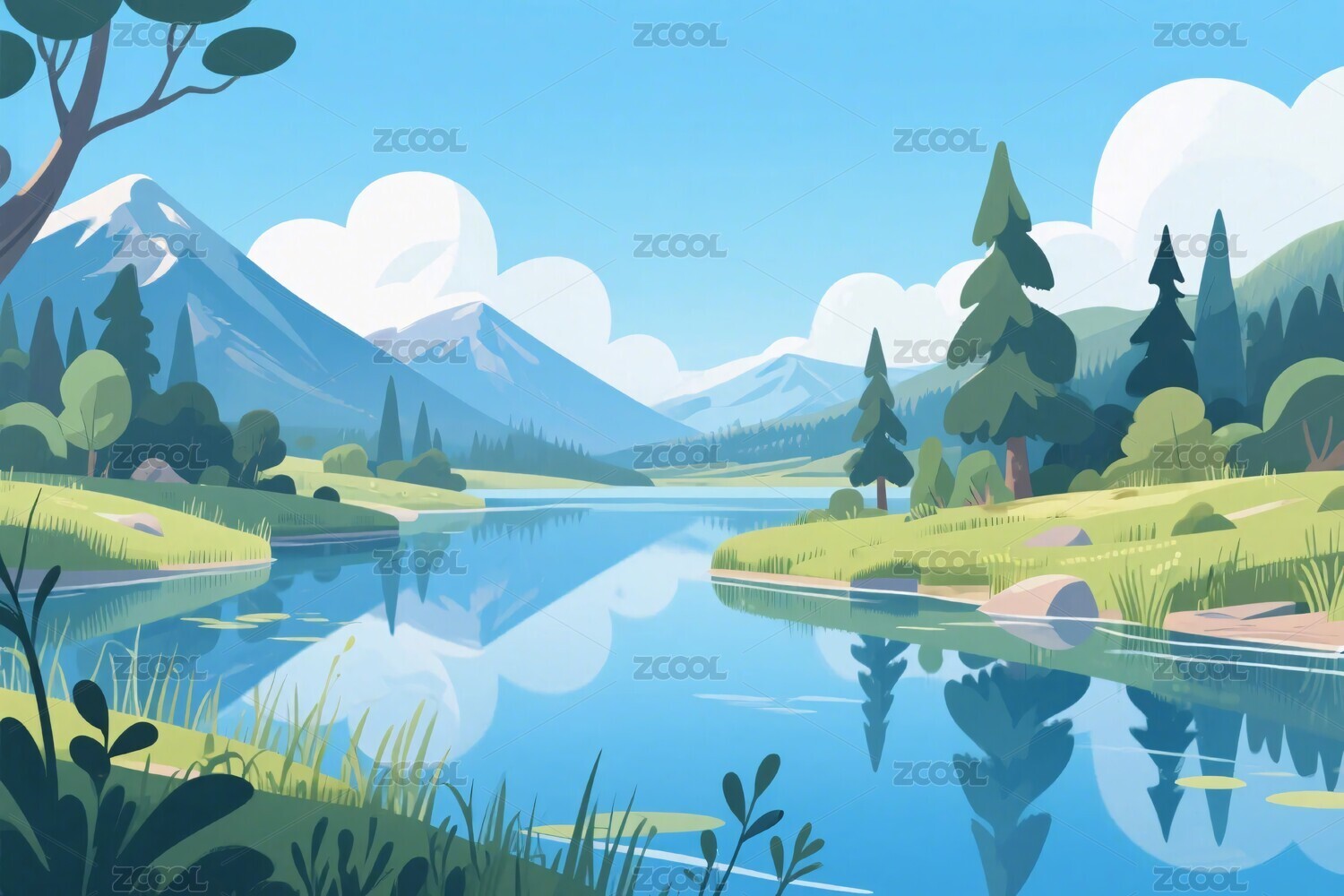 山水,河流,房屋,树木,山脉,风景,自然,插画,扁平,矢量