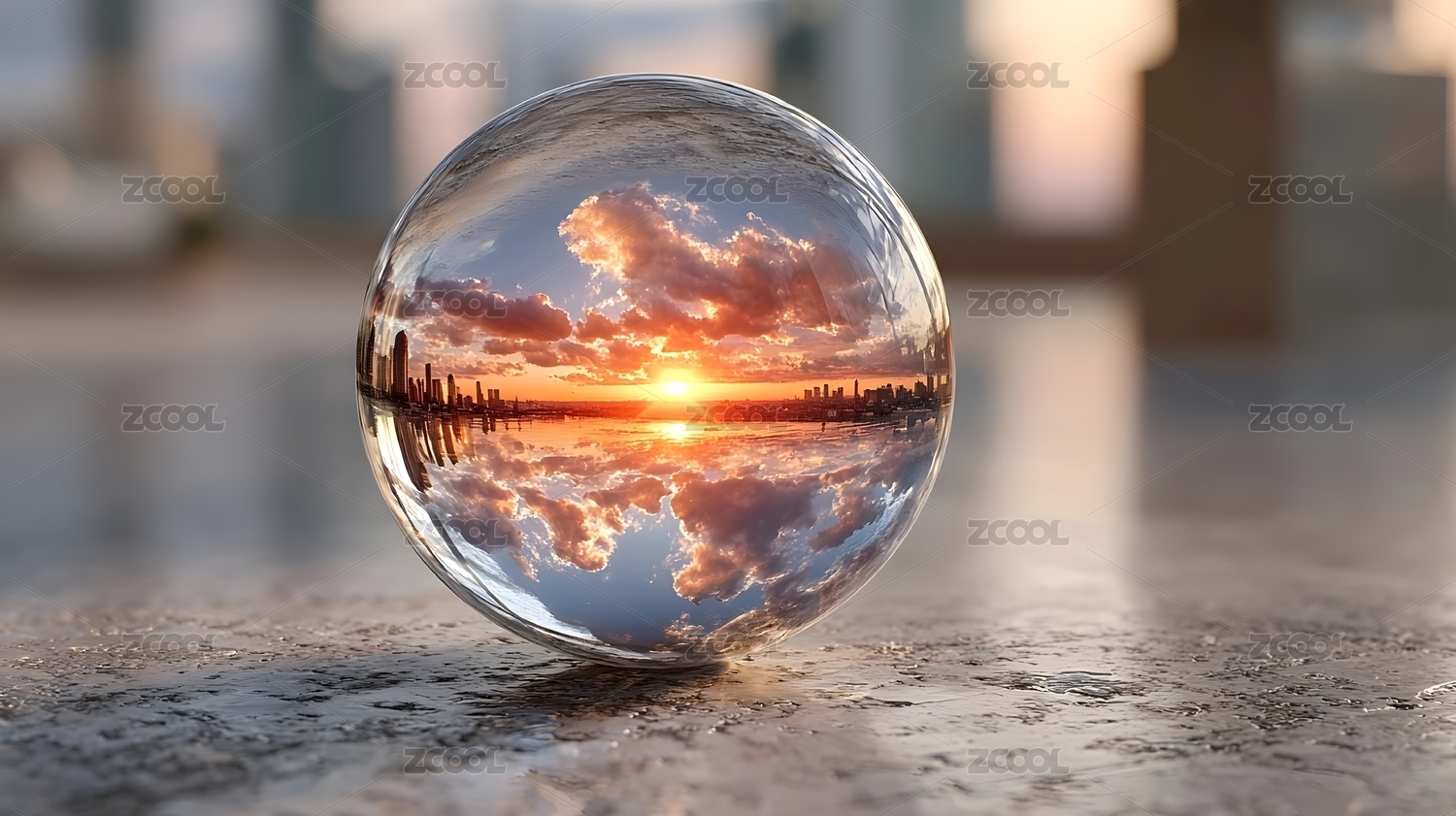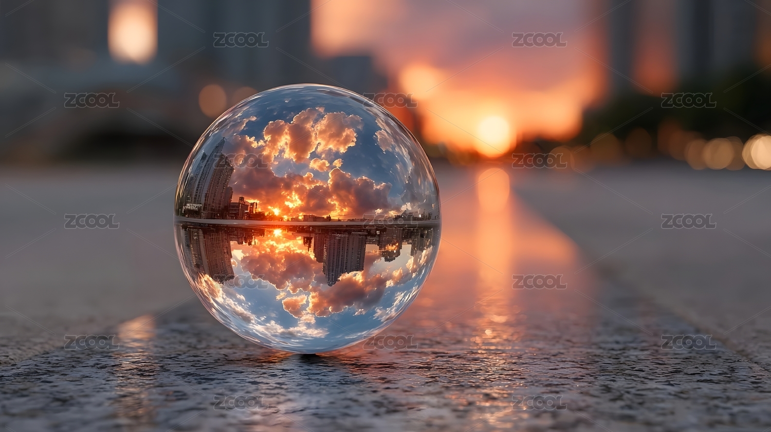 :城市 倒影 水晶球 日落 摩天大楼 水