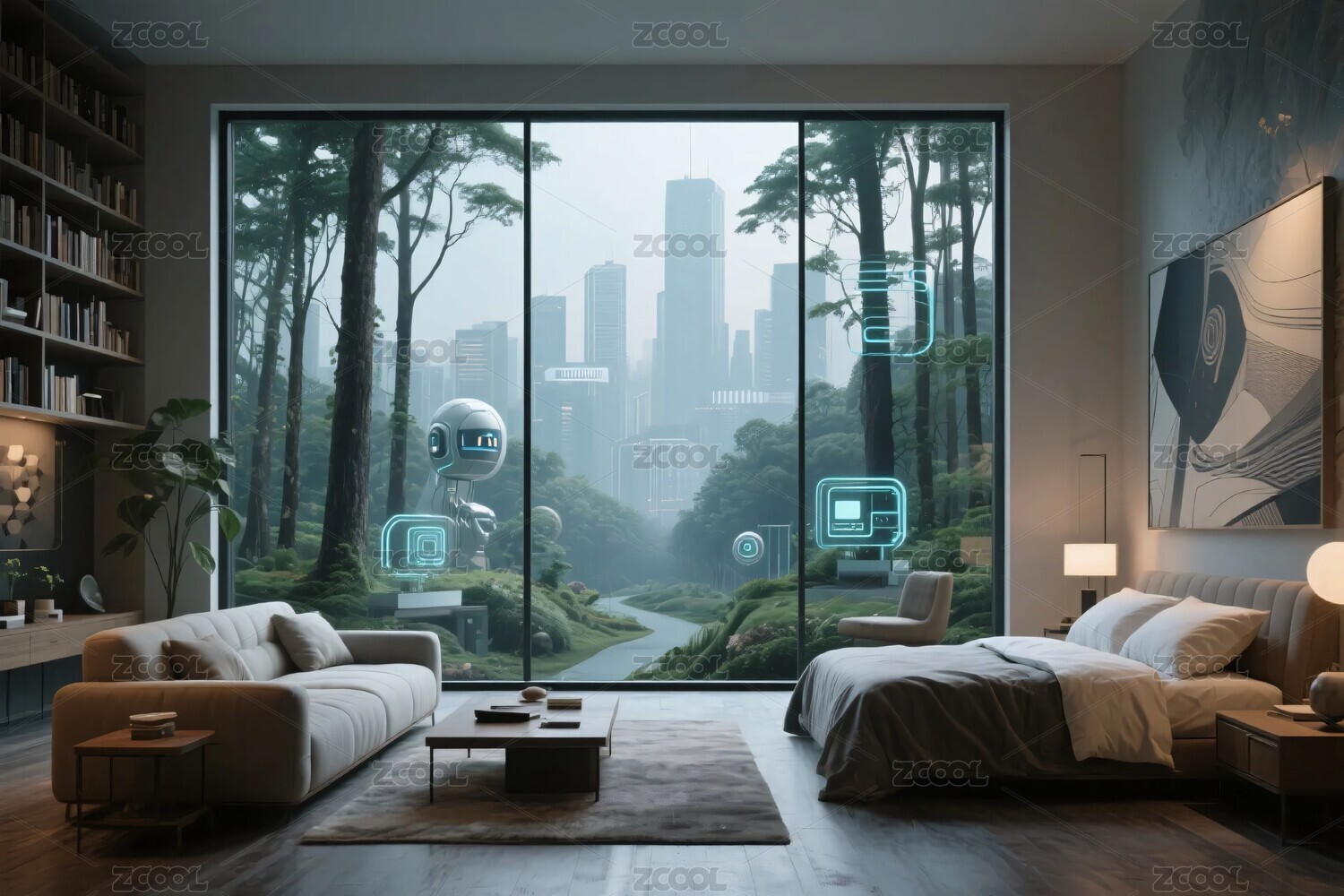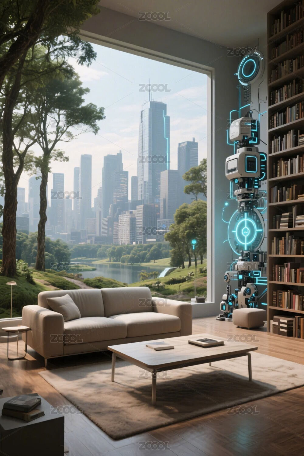 客厅,沙发,电视,书本,机器人,城市景观,树木,未来,科技,智能家居