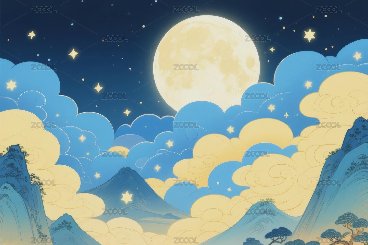 金色月亮下的蓝色山河