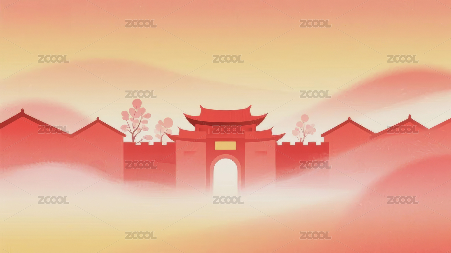 红色调中国古建筑插画