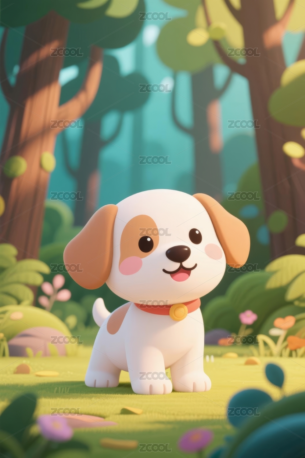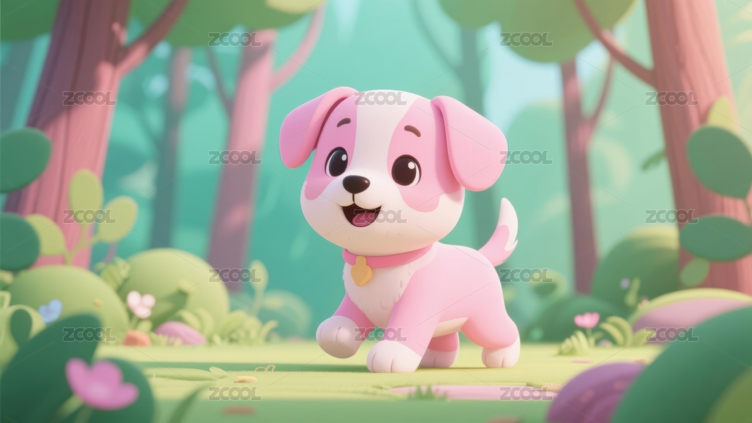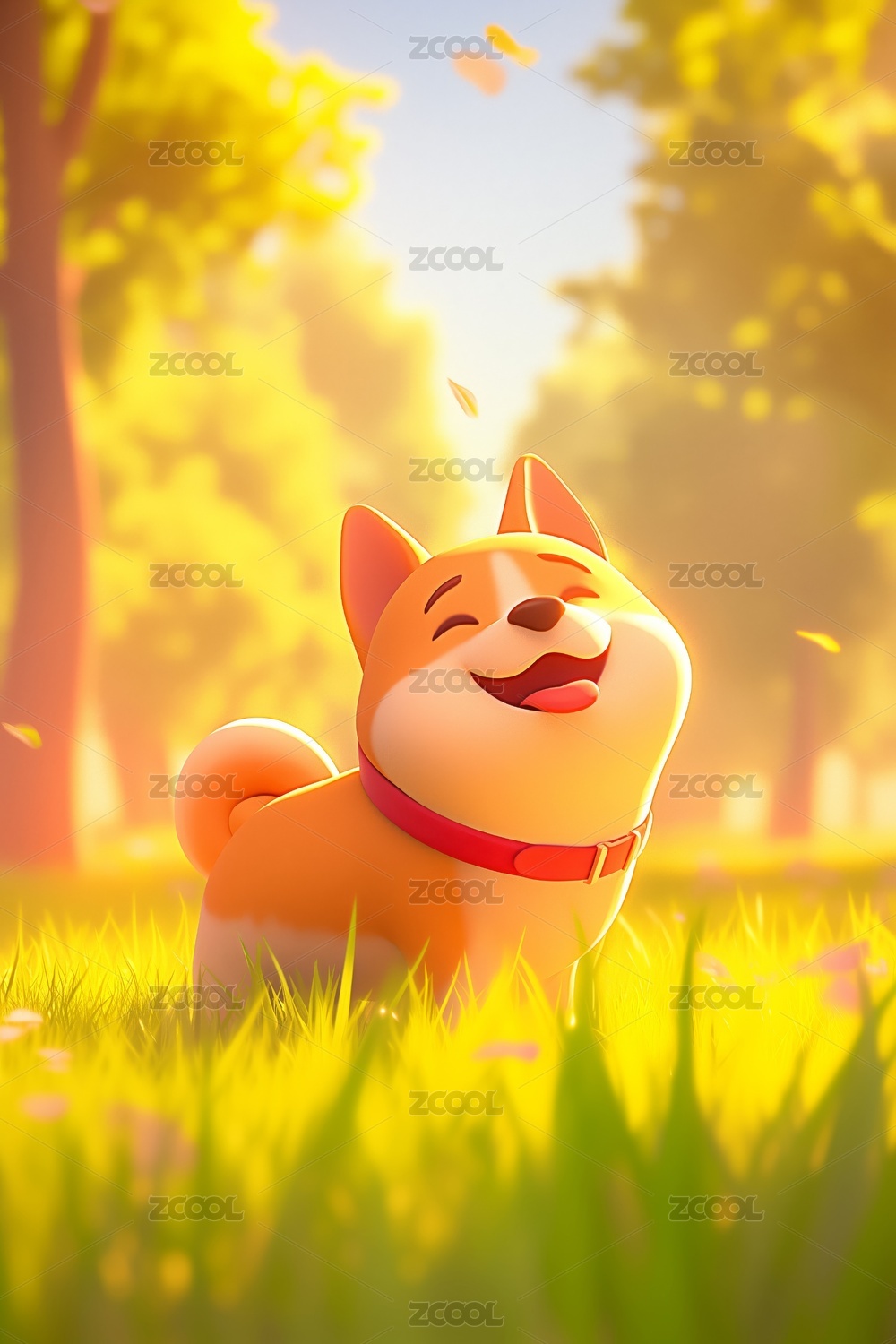 白天晴天绿色原野的宠物狗3D立体卡通插画
