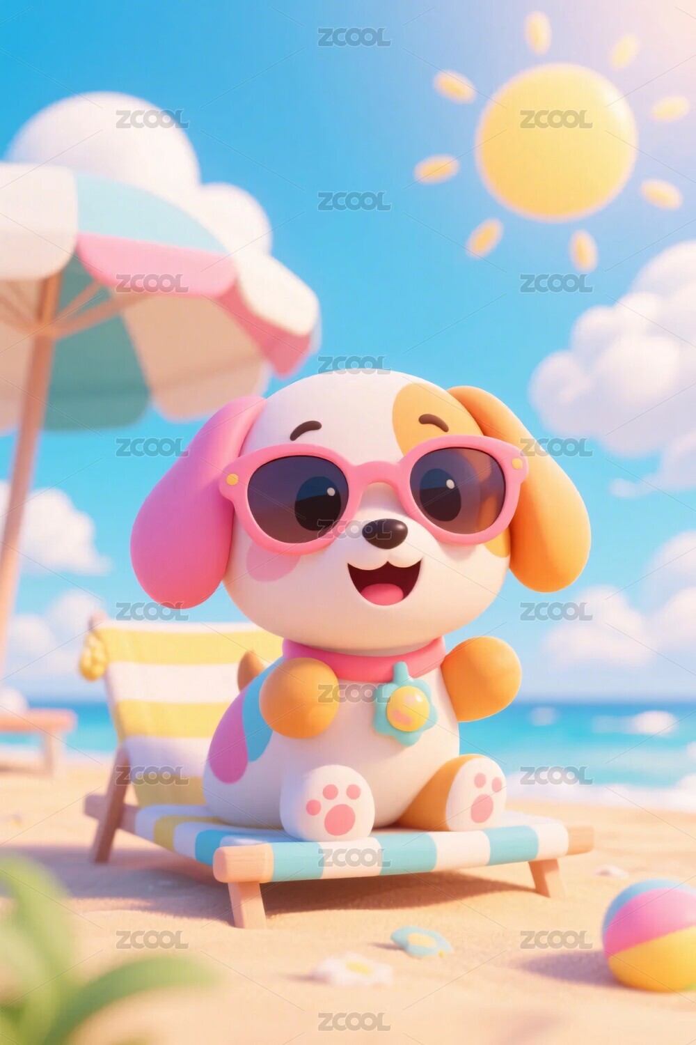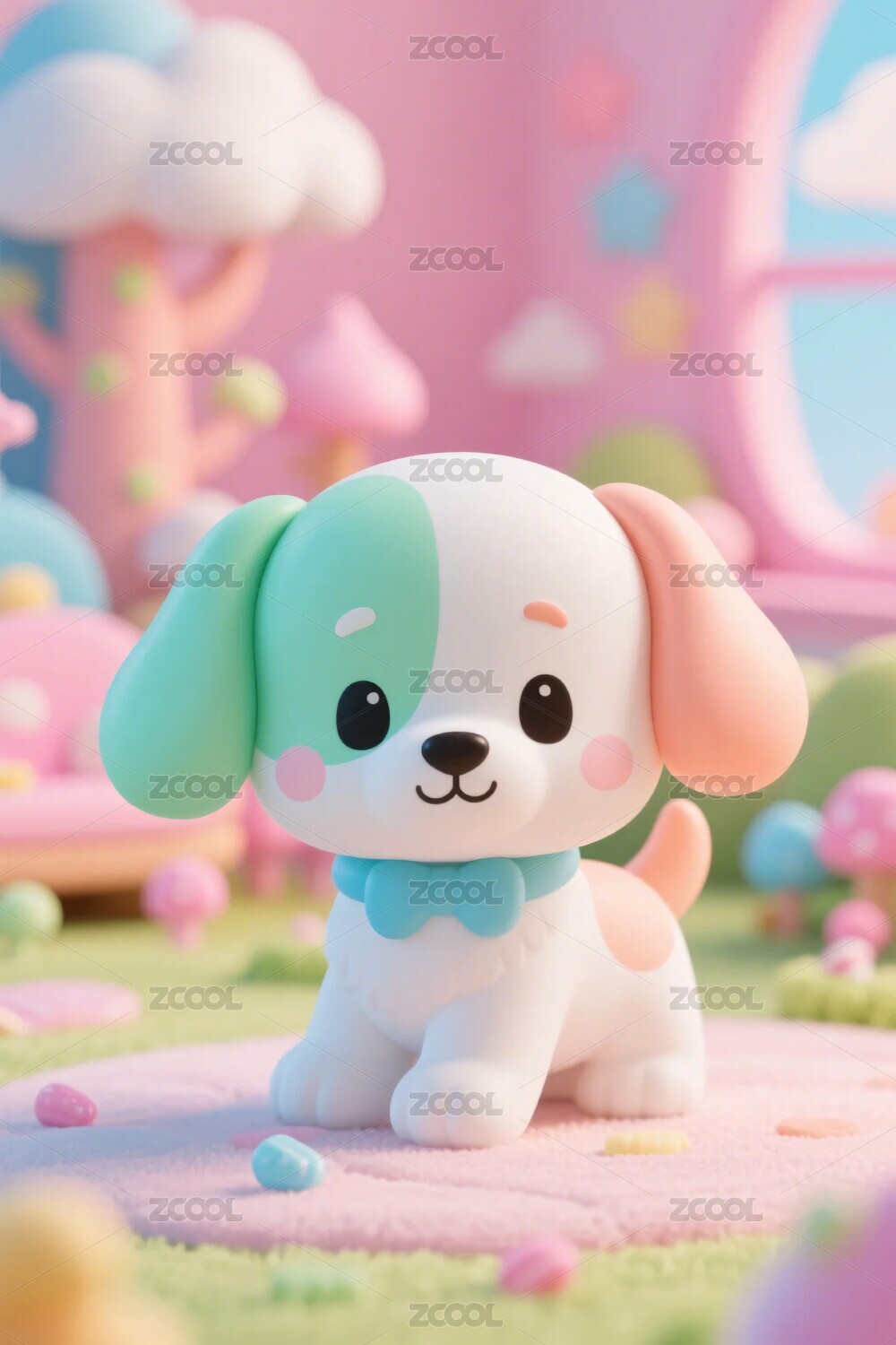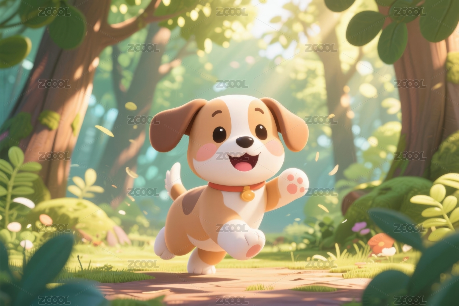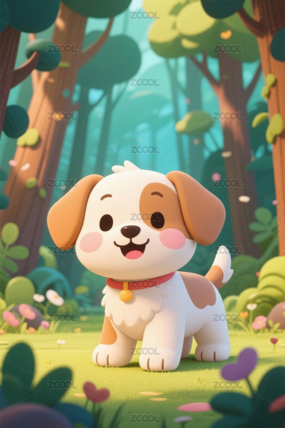 白天晴天绿色原野的宠物狗3D立体卡通插画