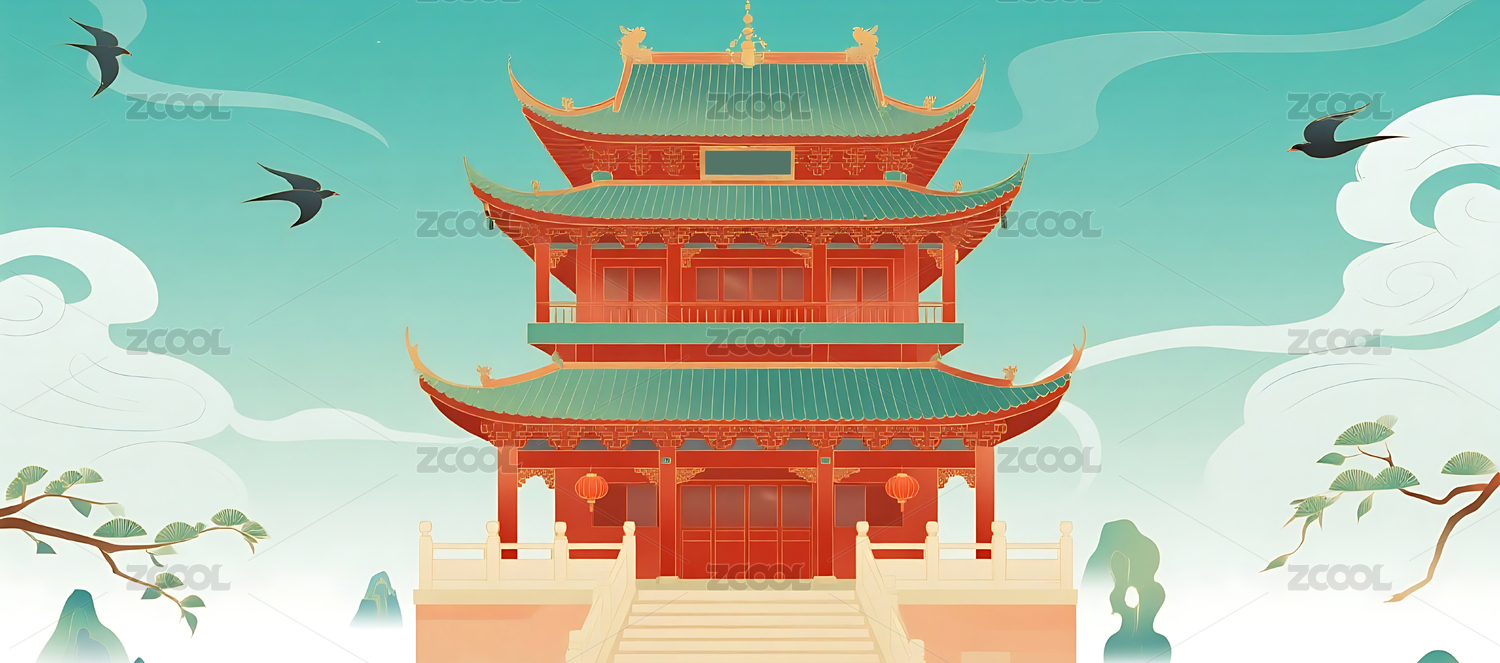 古风国潮风中式古建筑插画