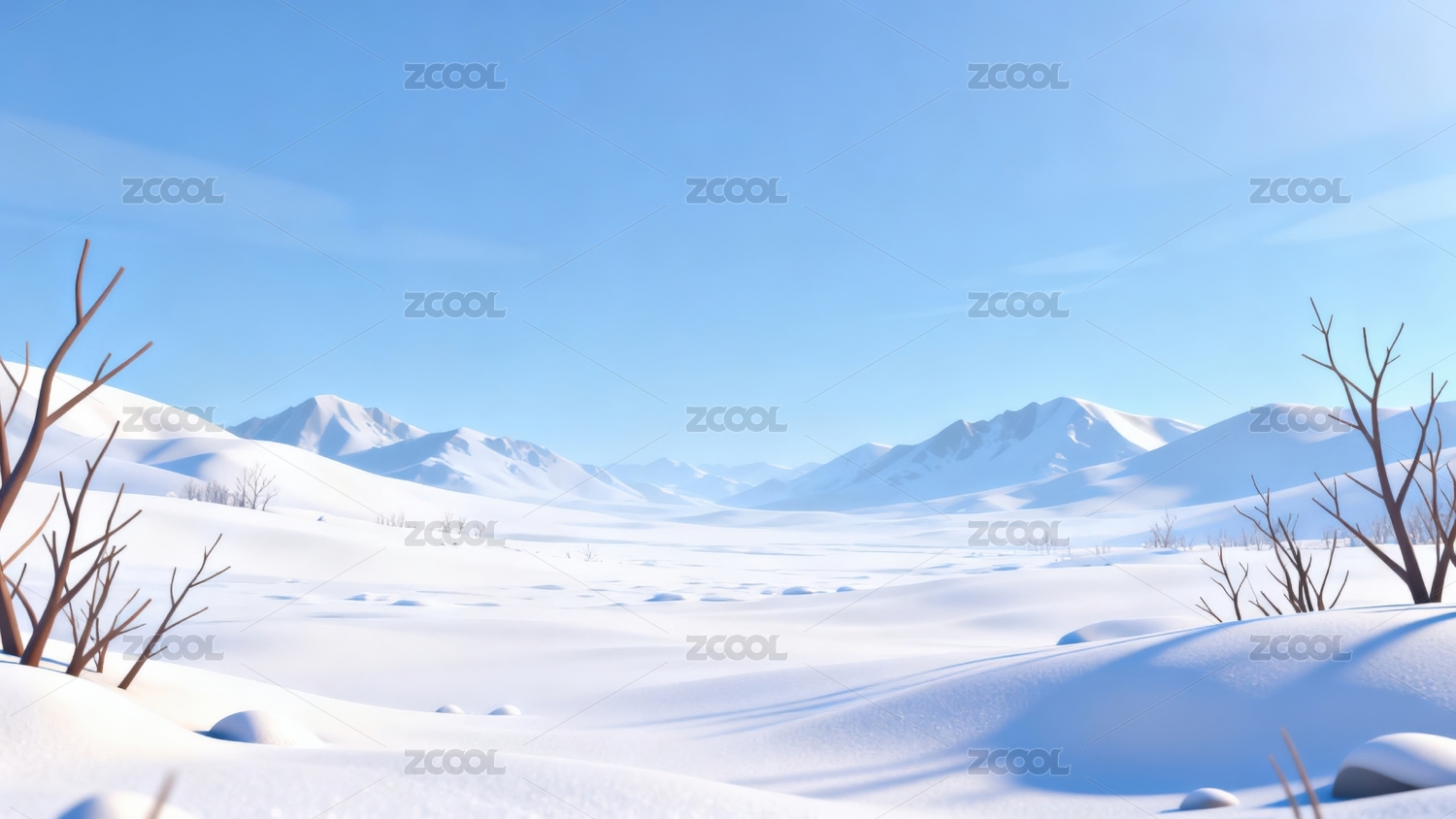 冬天清新明亮下雪的山丘河谷3D卡通背景