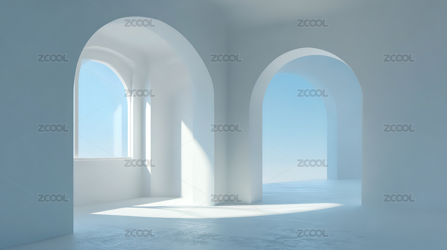白色拱门与光影的室内空间