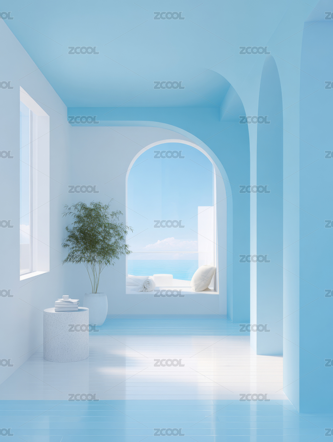 蓝色拱门通向海景的宁静空间
