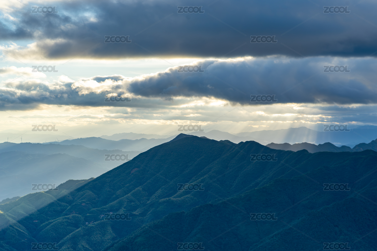 蓝天白云下远处山峦云遮雾绕近处山峦起伏间高压输电线横穿其中