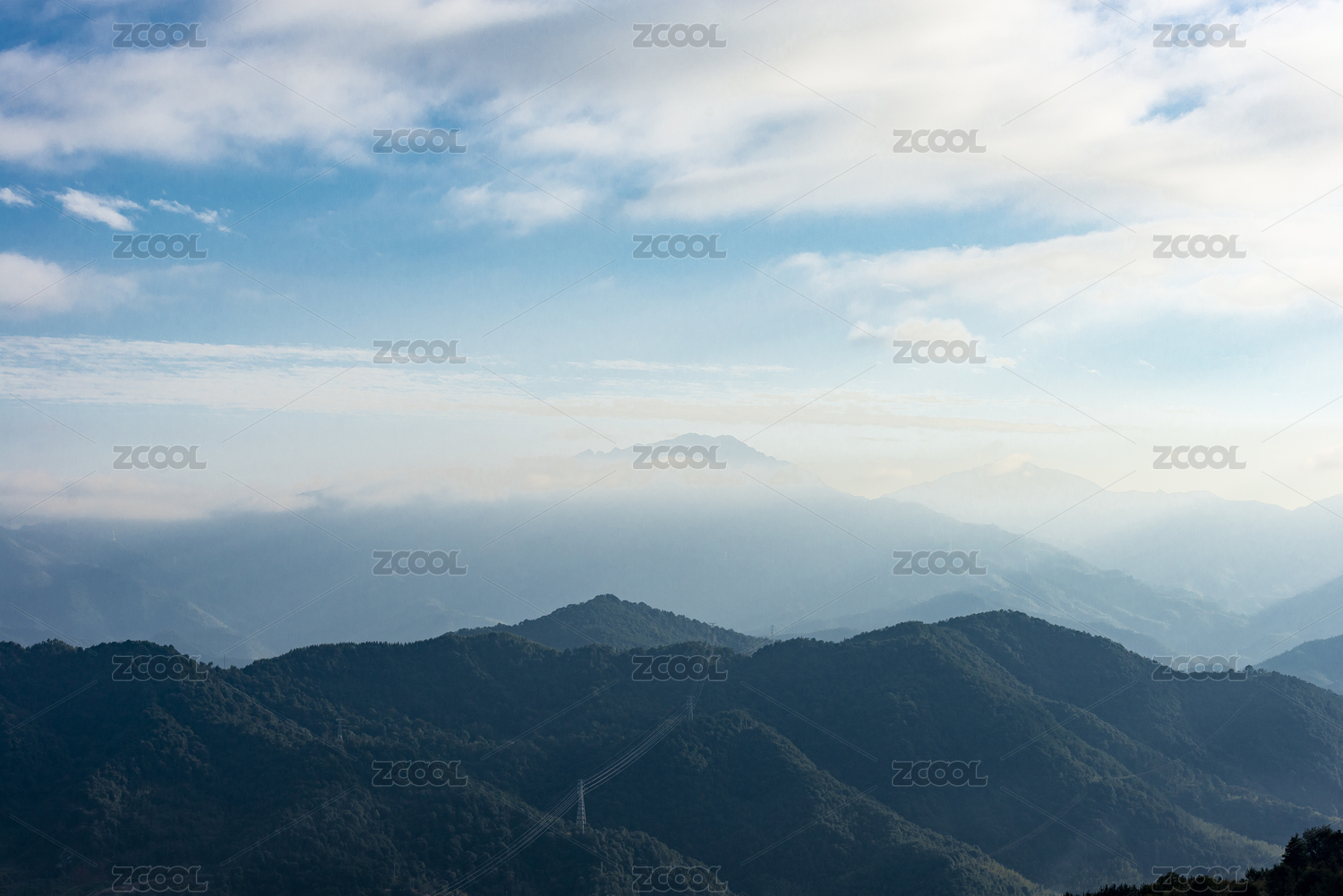 蓝天白云下远处山峦云遮雾绕近处山峦起伏间高压输电线横穿其中