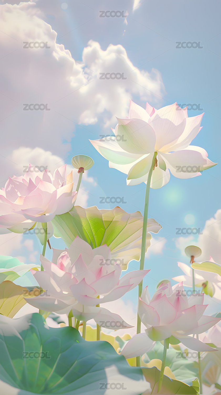 夏天蓝天白云下荷花盛开