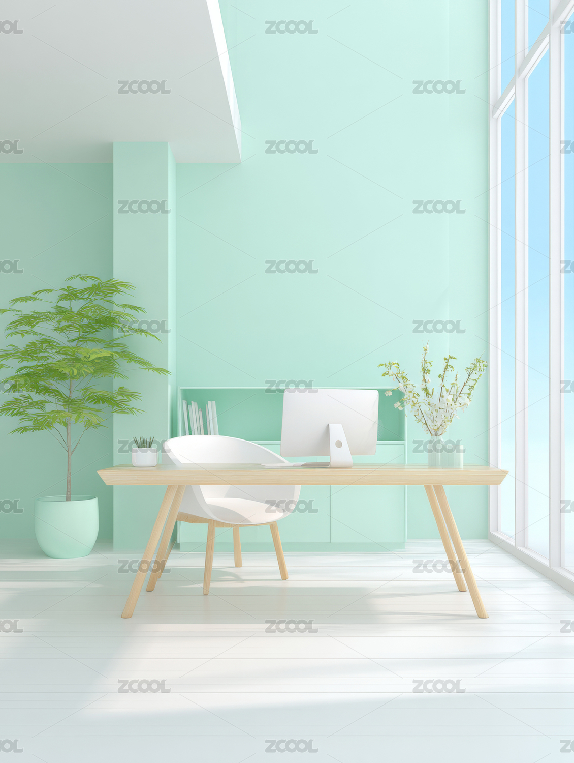 办公桌,椅子,笔记本电脑,绿植,窗户,地毯,室内,设计,明亮,简洁