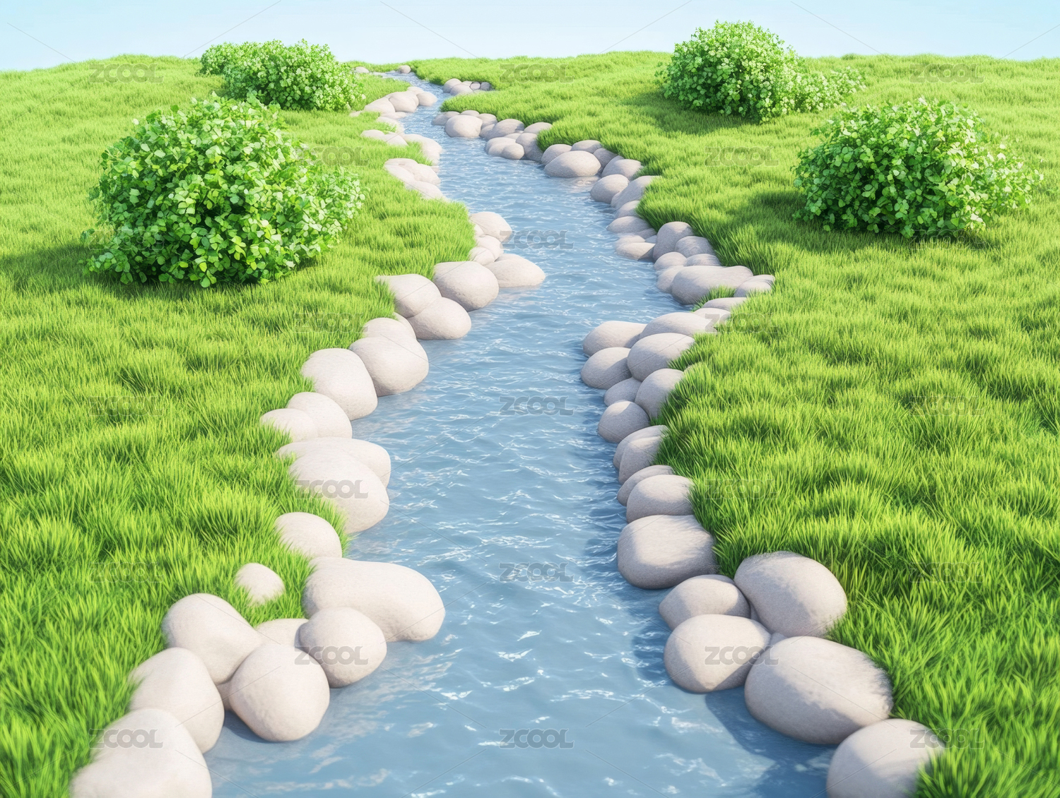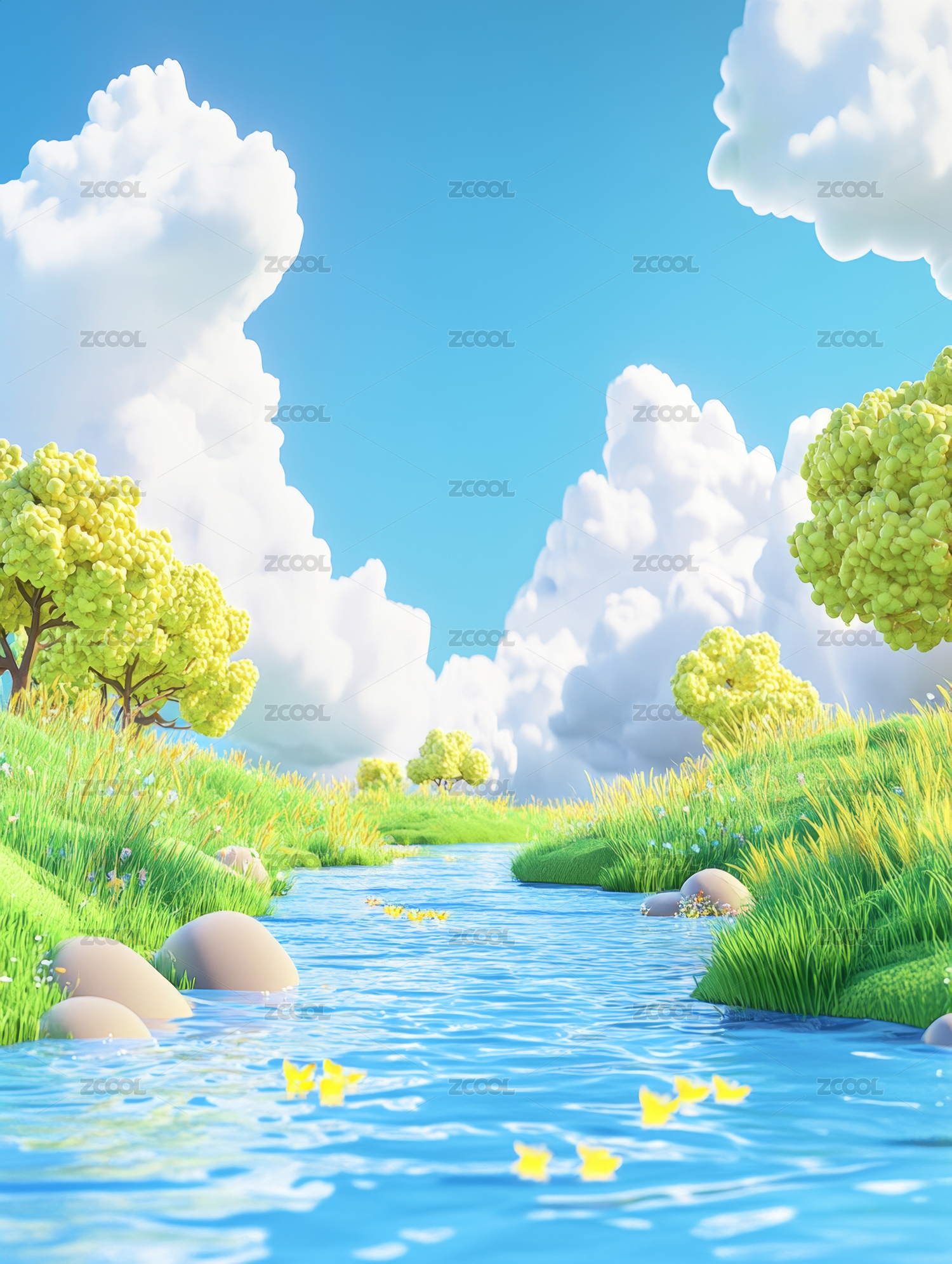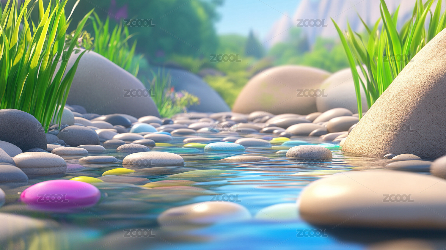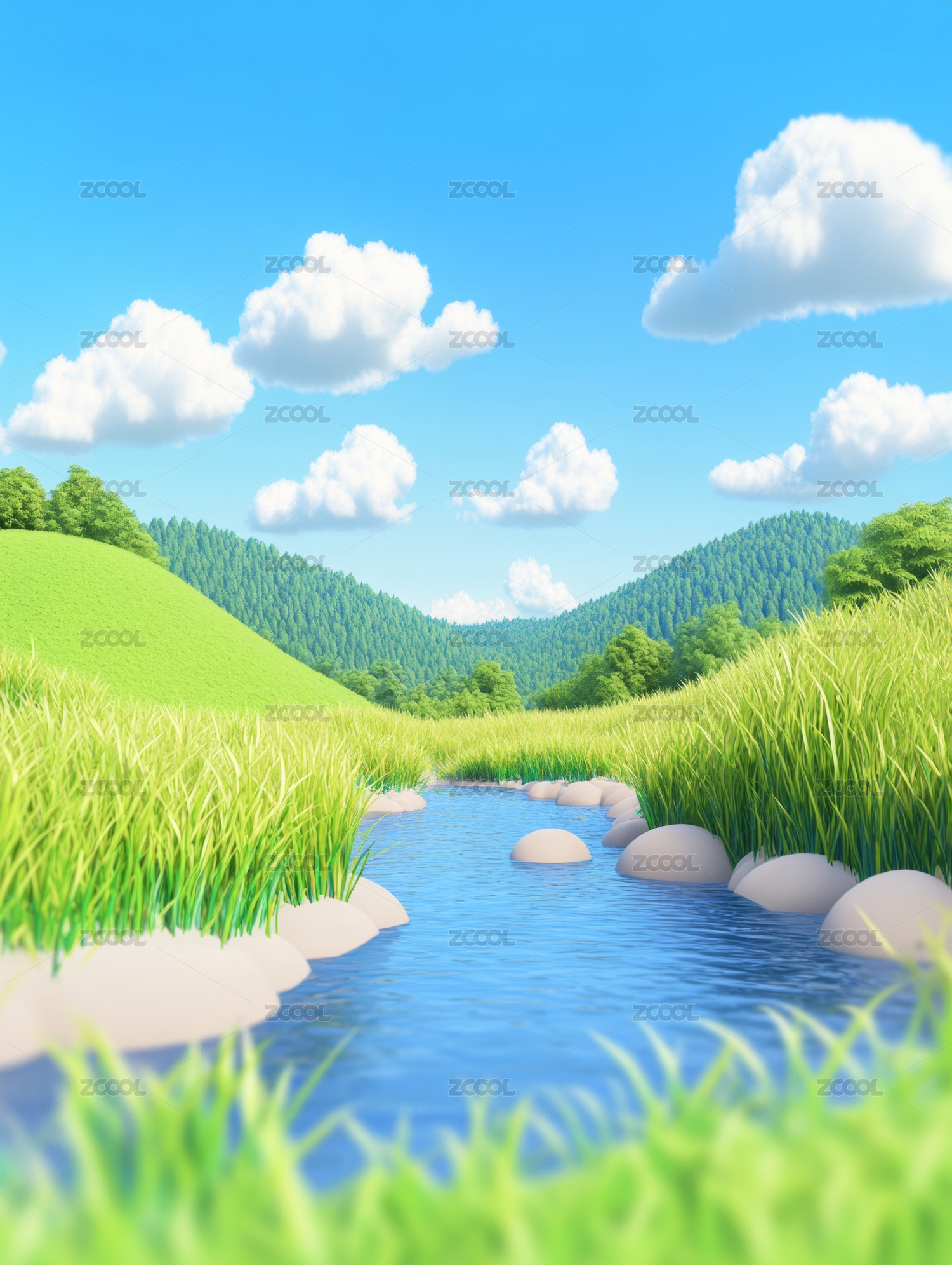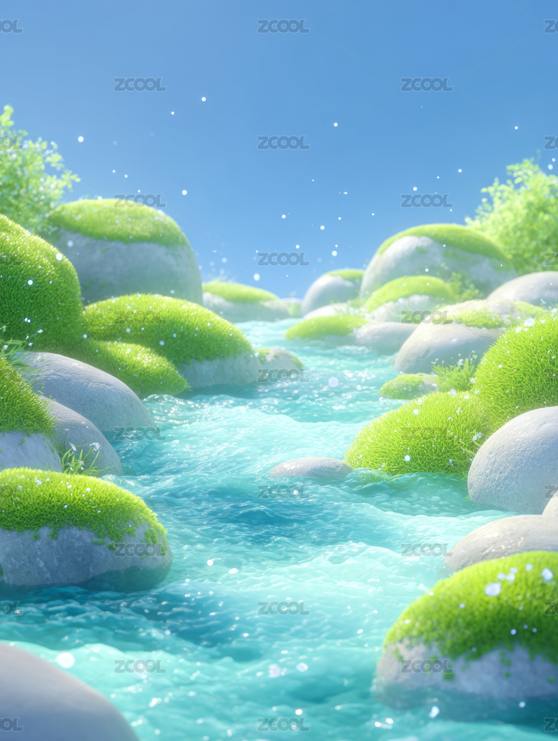 溪流,绿植,石头,水,自然,清新,蓝天,卡通,风格