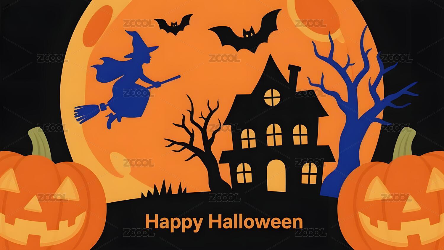 万圣节夜景:女巫飞过南瓜灯与鬼屋